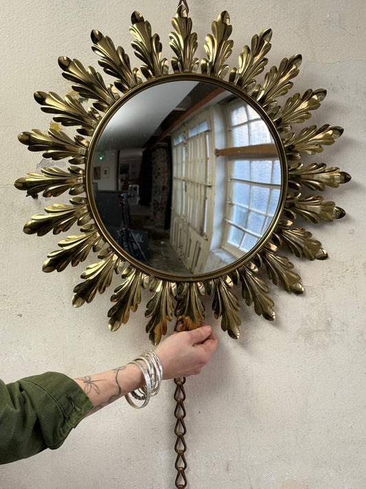 A Round Sunburst Brass Leaf Mirror by Deknudt, 1950’s.