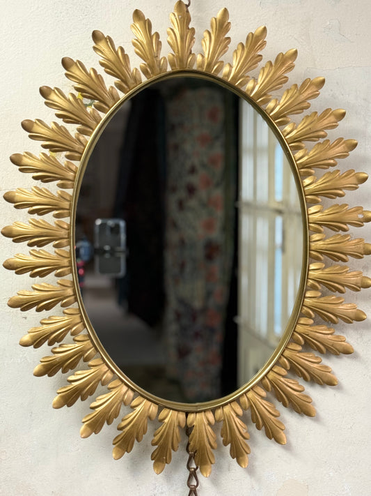 An Oval Sunburst Brass Leaf Mirror by Deknudt, 1950’s