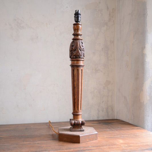 Large Oak Table Lamp - Reeded Column with Carved Leaf