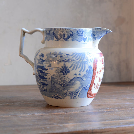 Blue & White Willow Pattern Jug with Scottish Inscription John & Marg Niven, Newbattle c1826