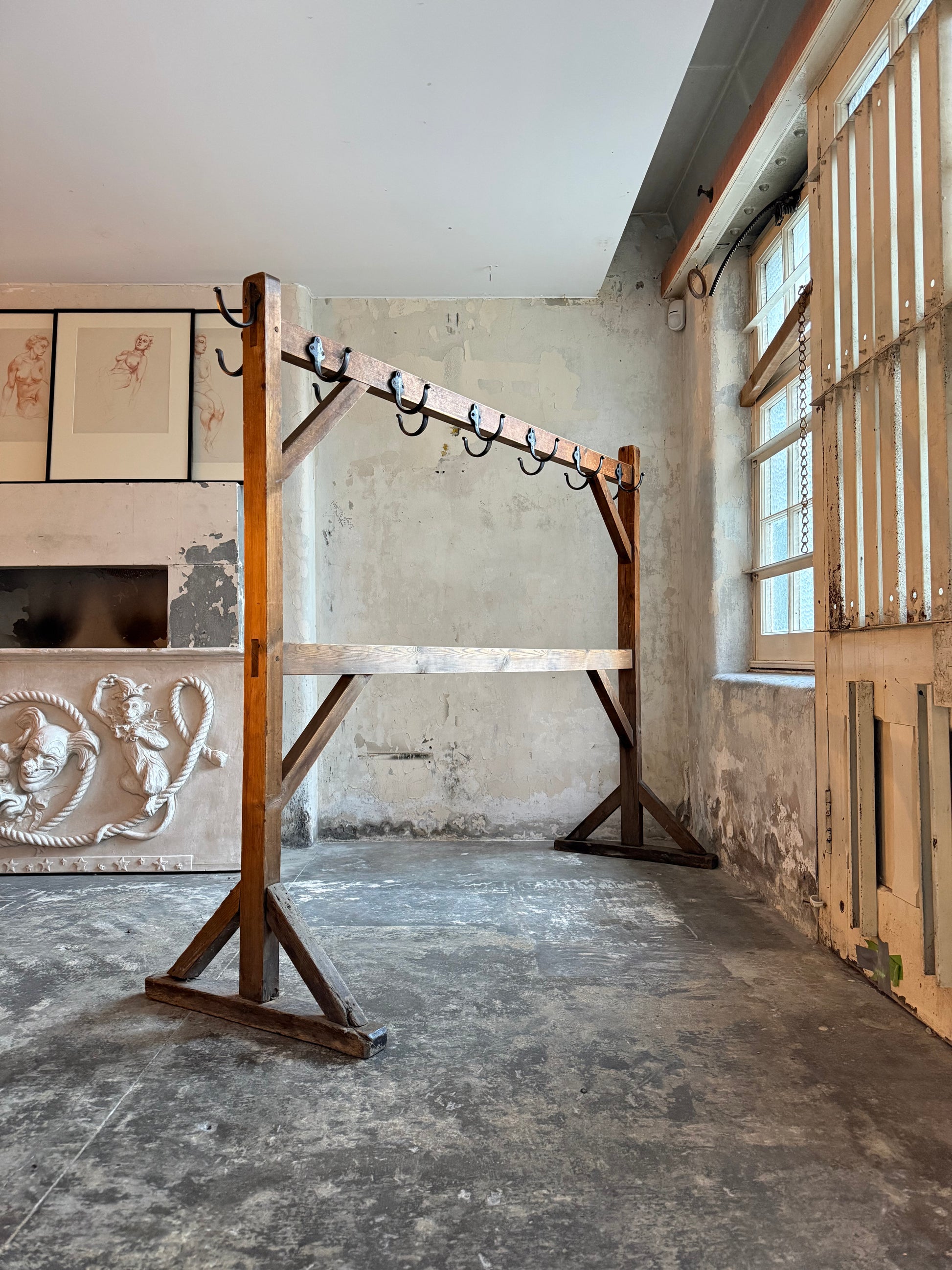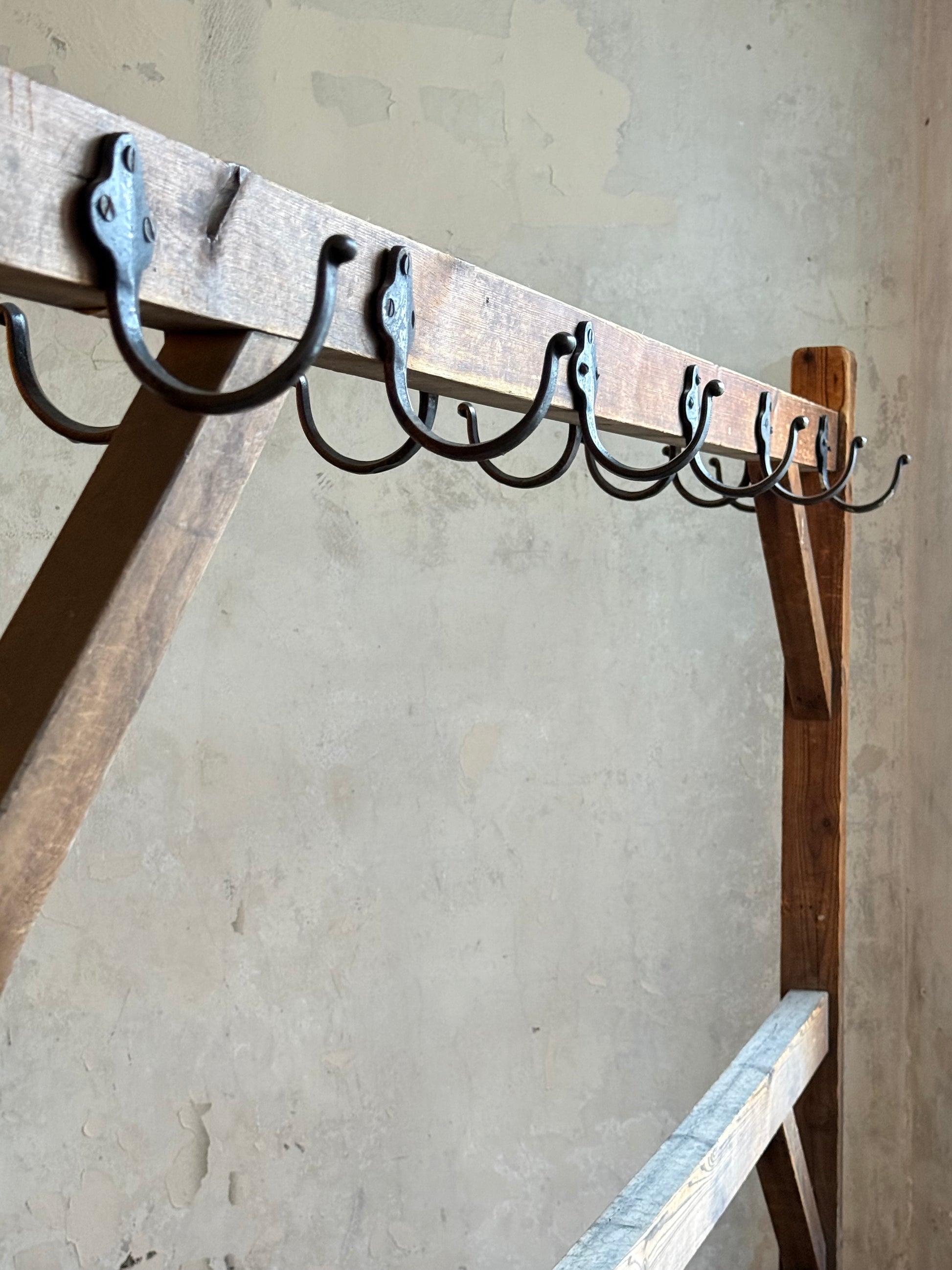In house, factory made double sided ribbon drying rack, with pine structure and hand forged hooks.