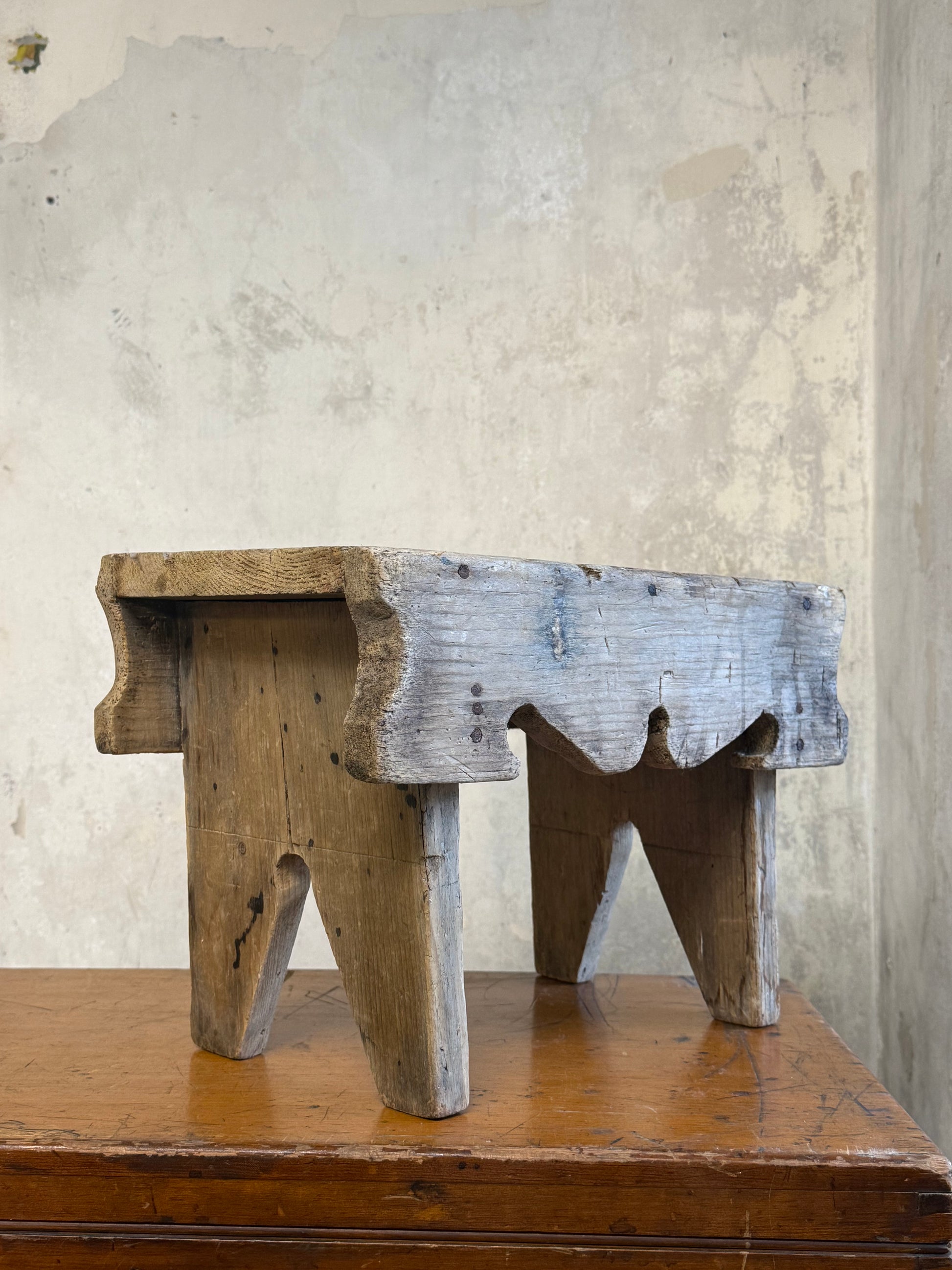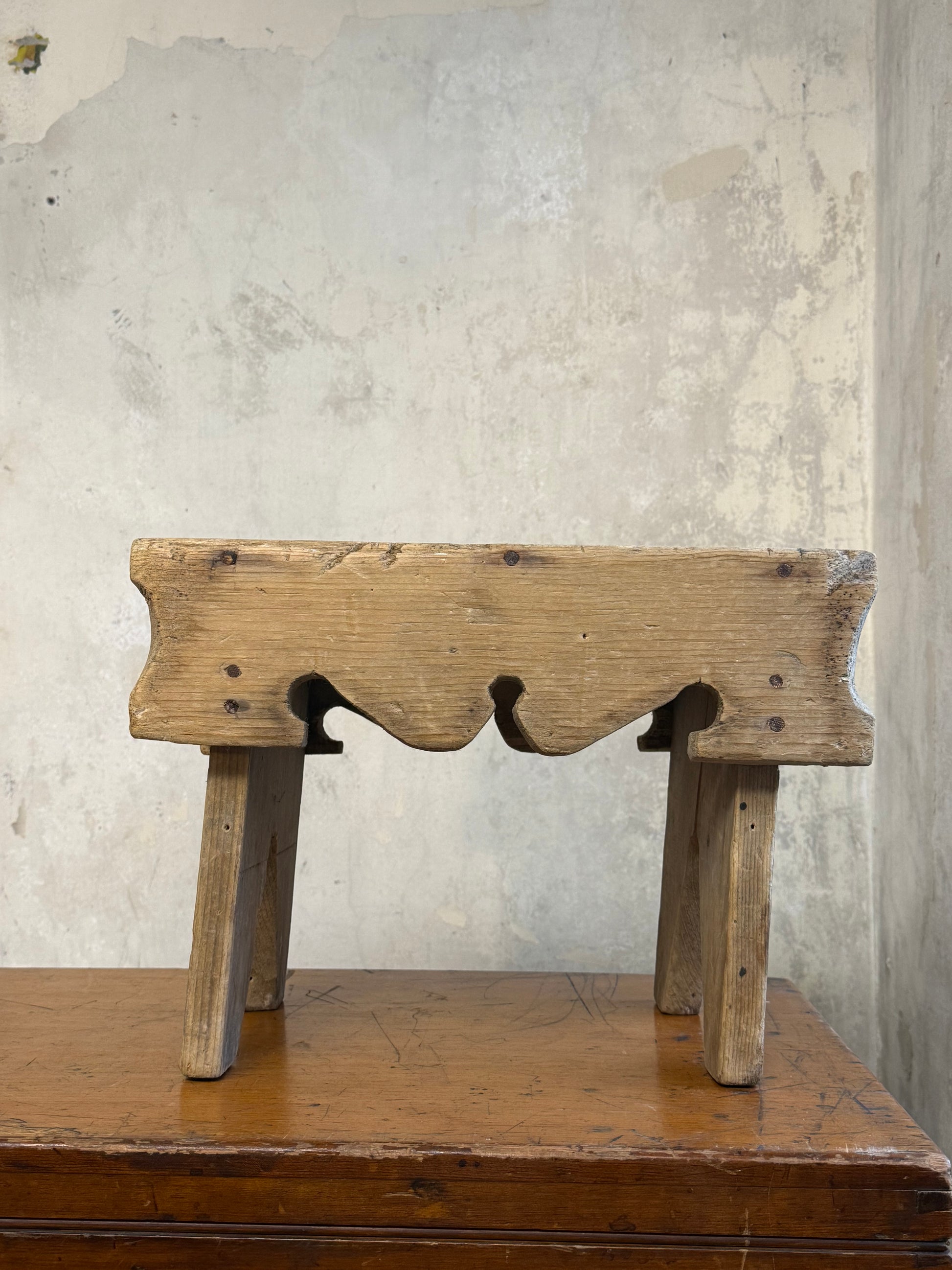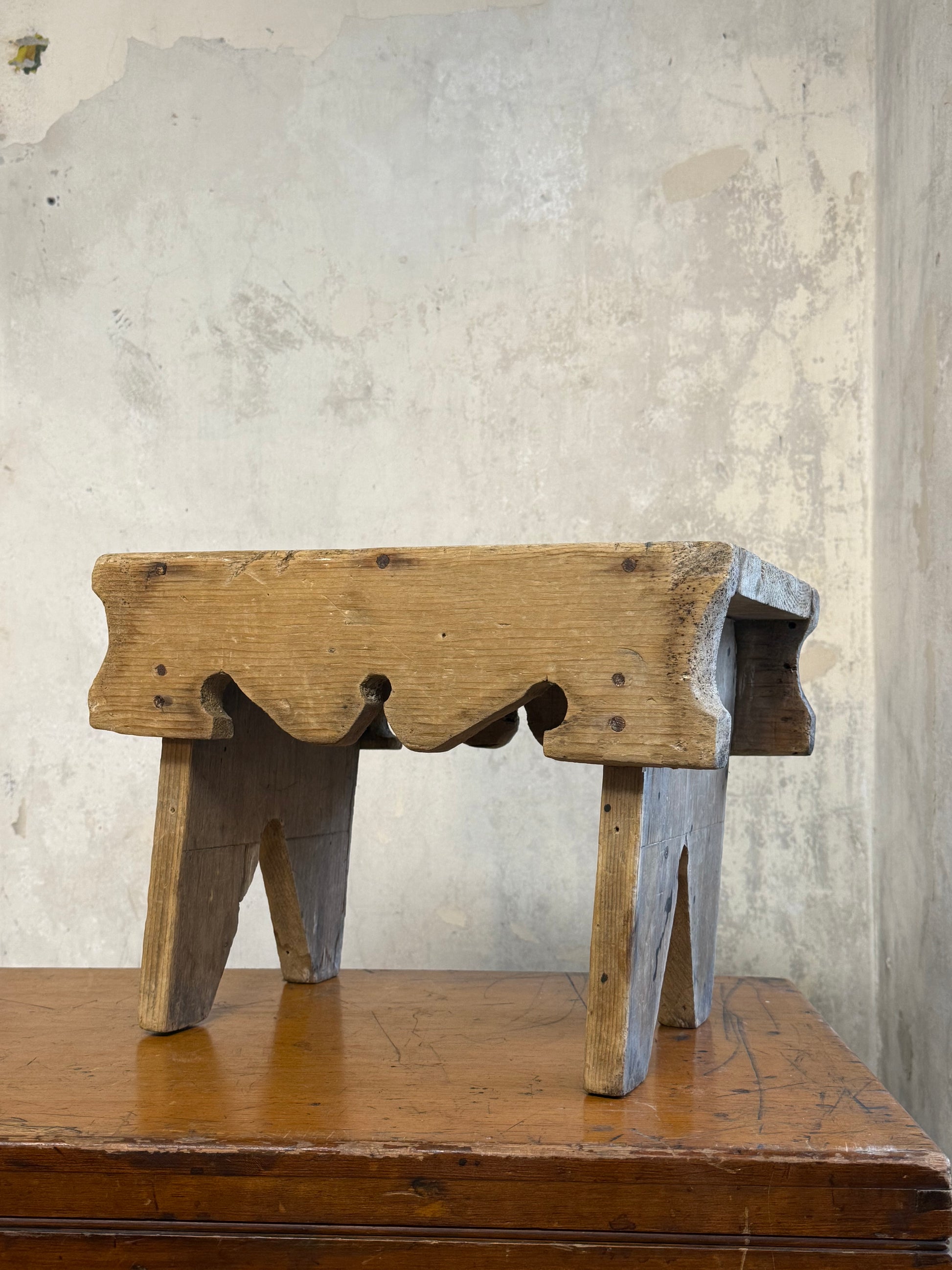 A Vernacular Creepie or Five Boarded Stool, in pine, with decorative side panels. Central finger cut hole for lifting.