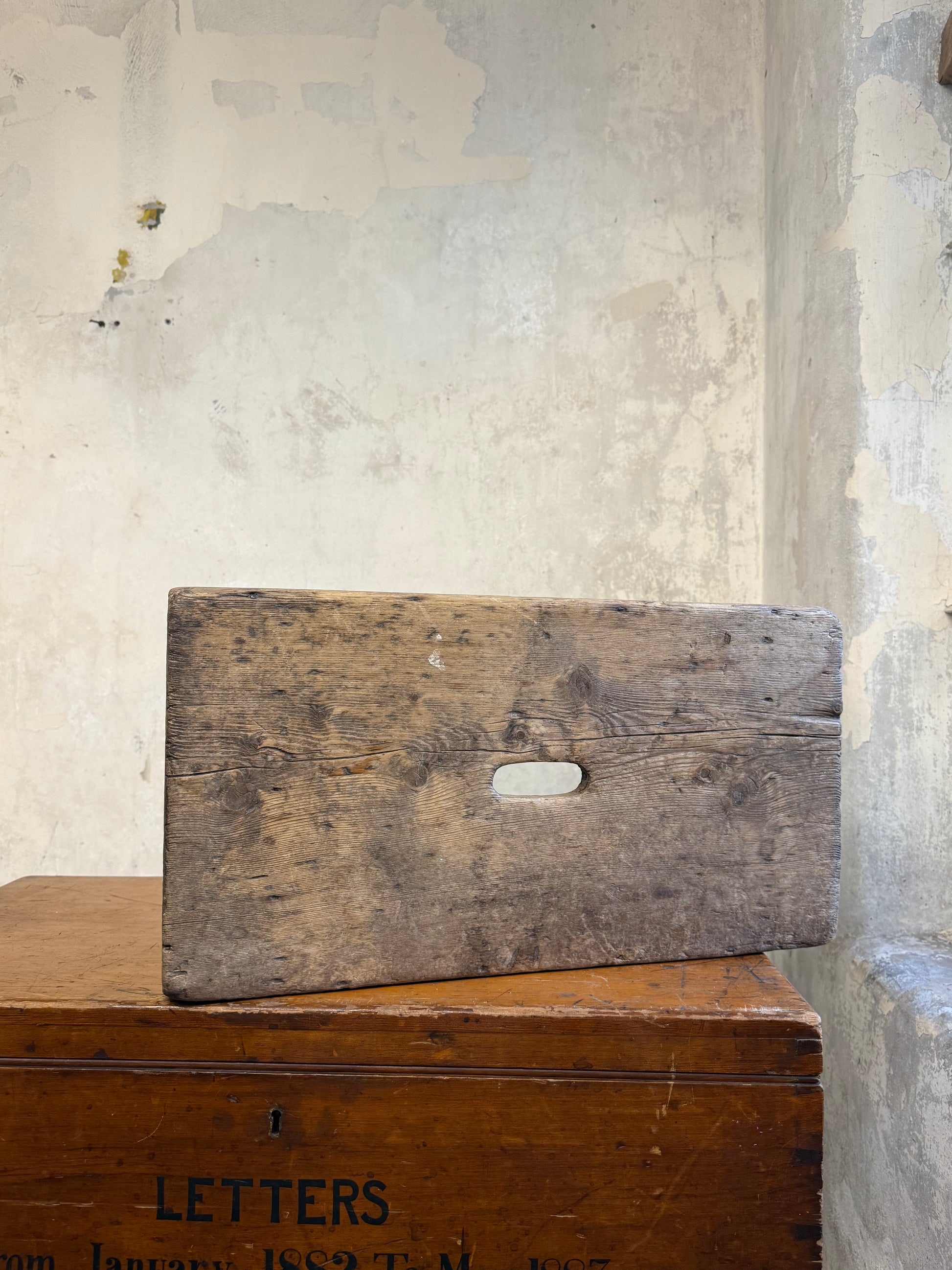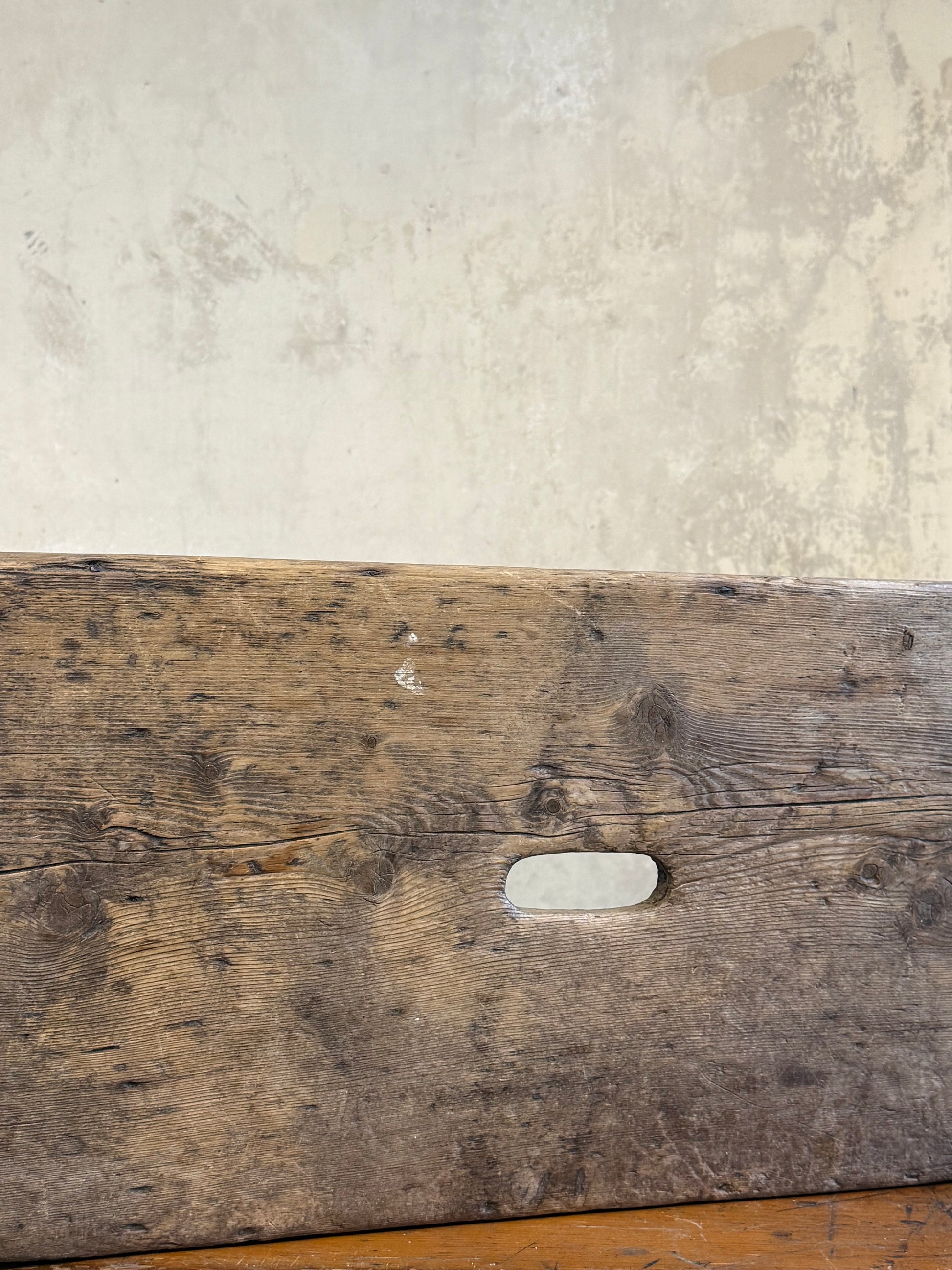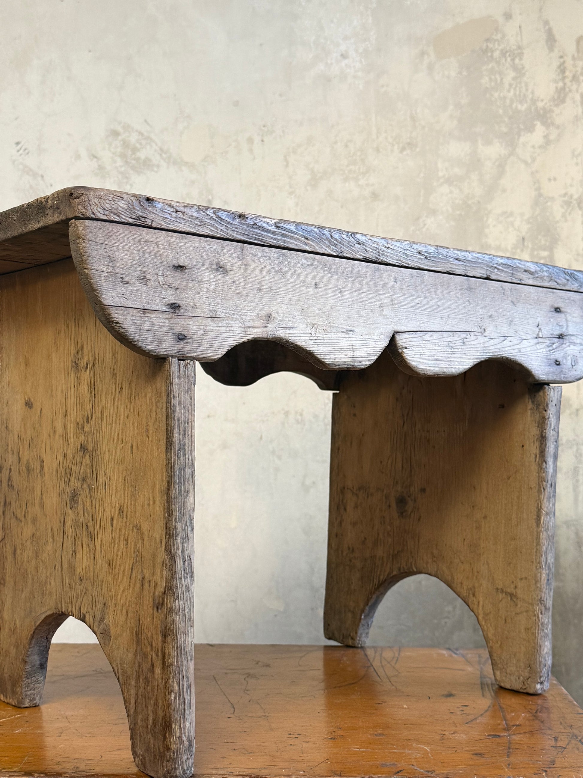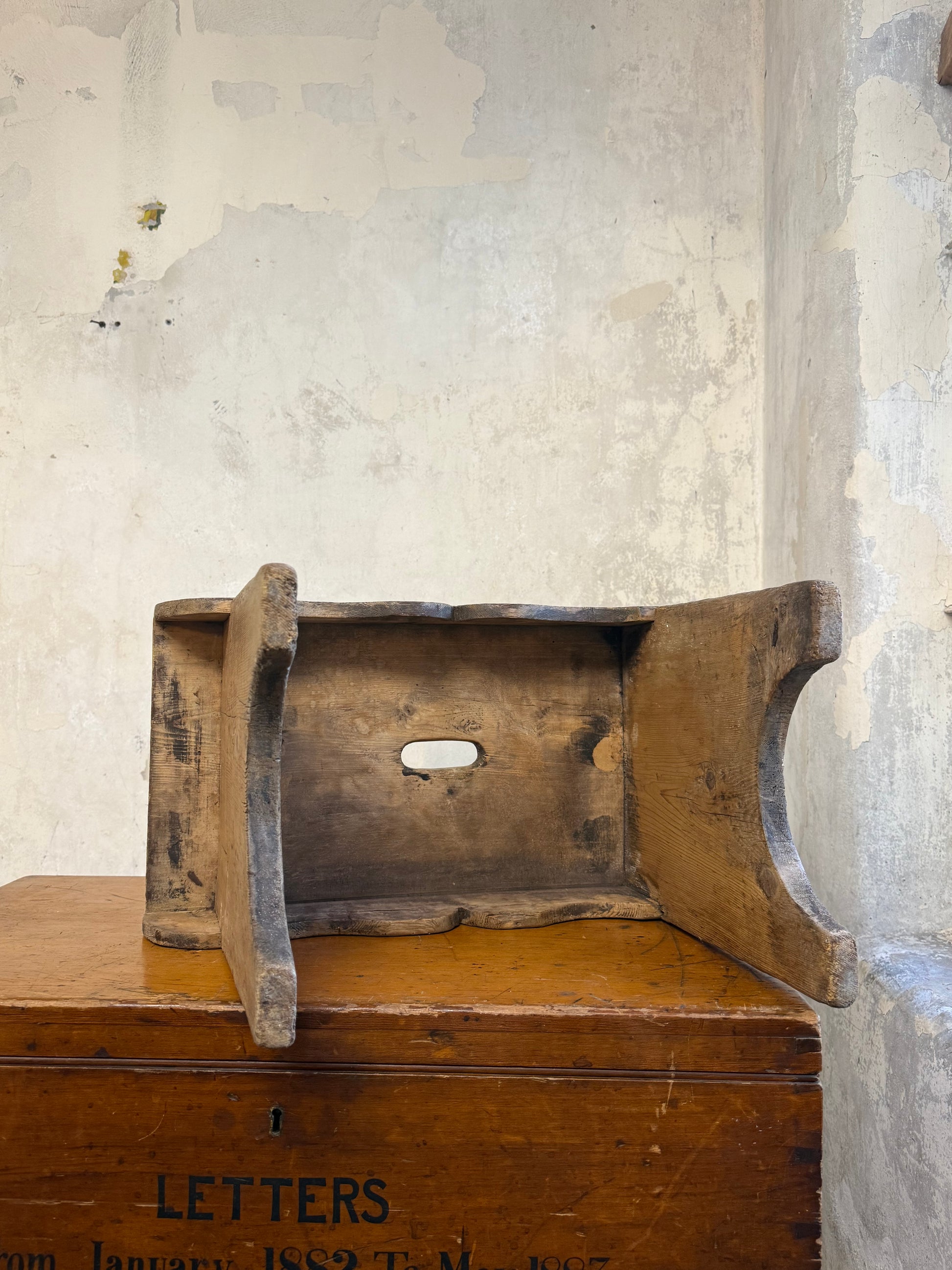 A Vernacular Creepie or Five Boarded Stool, in pine, with decorative side panels. Central finger cut hole for lifting.