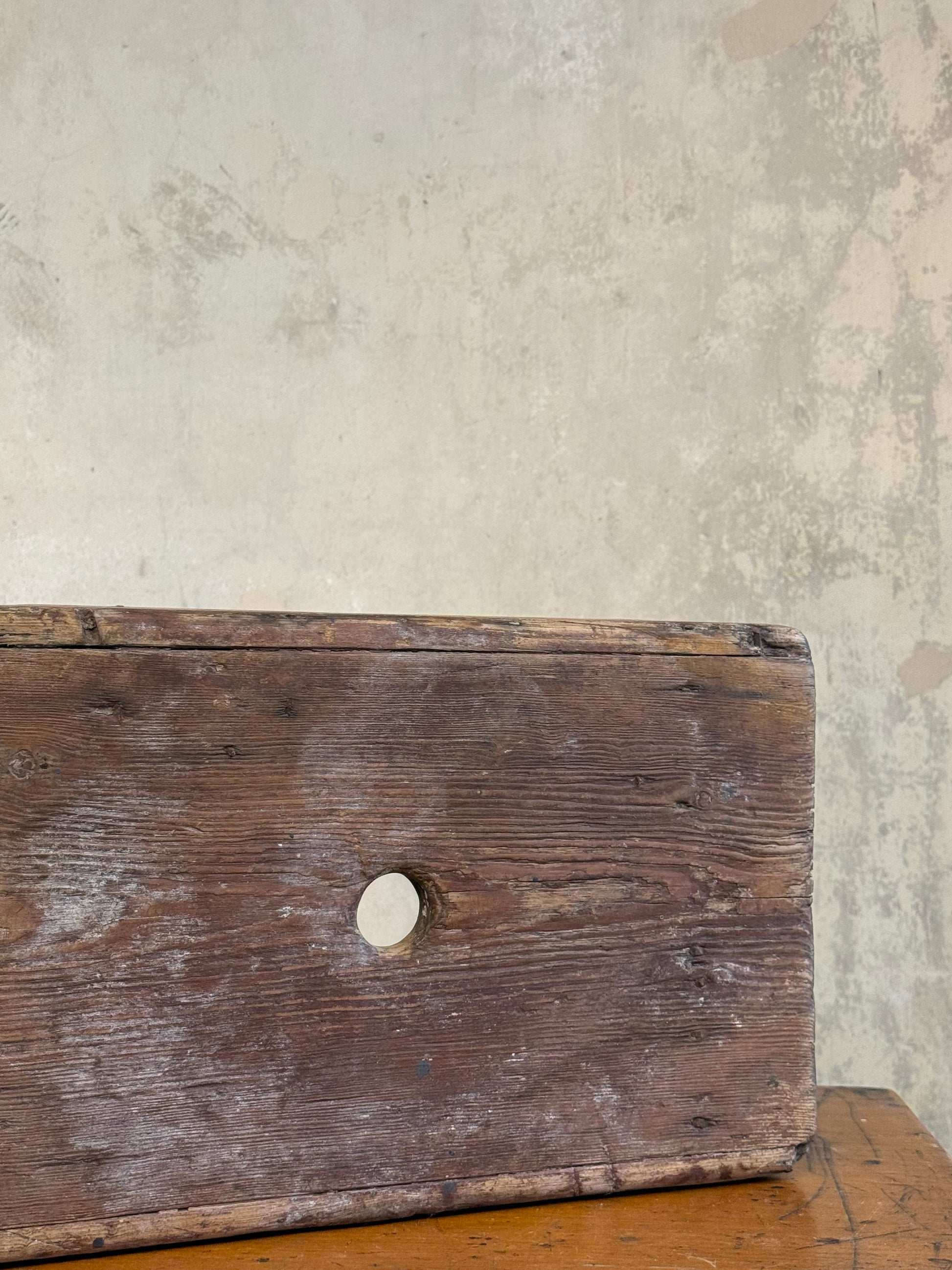 A Vernacular Creepie or Five Boarded Stool, in pine, with decorative side panels. Central finger cut hole for lifting.