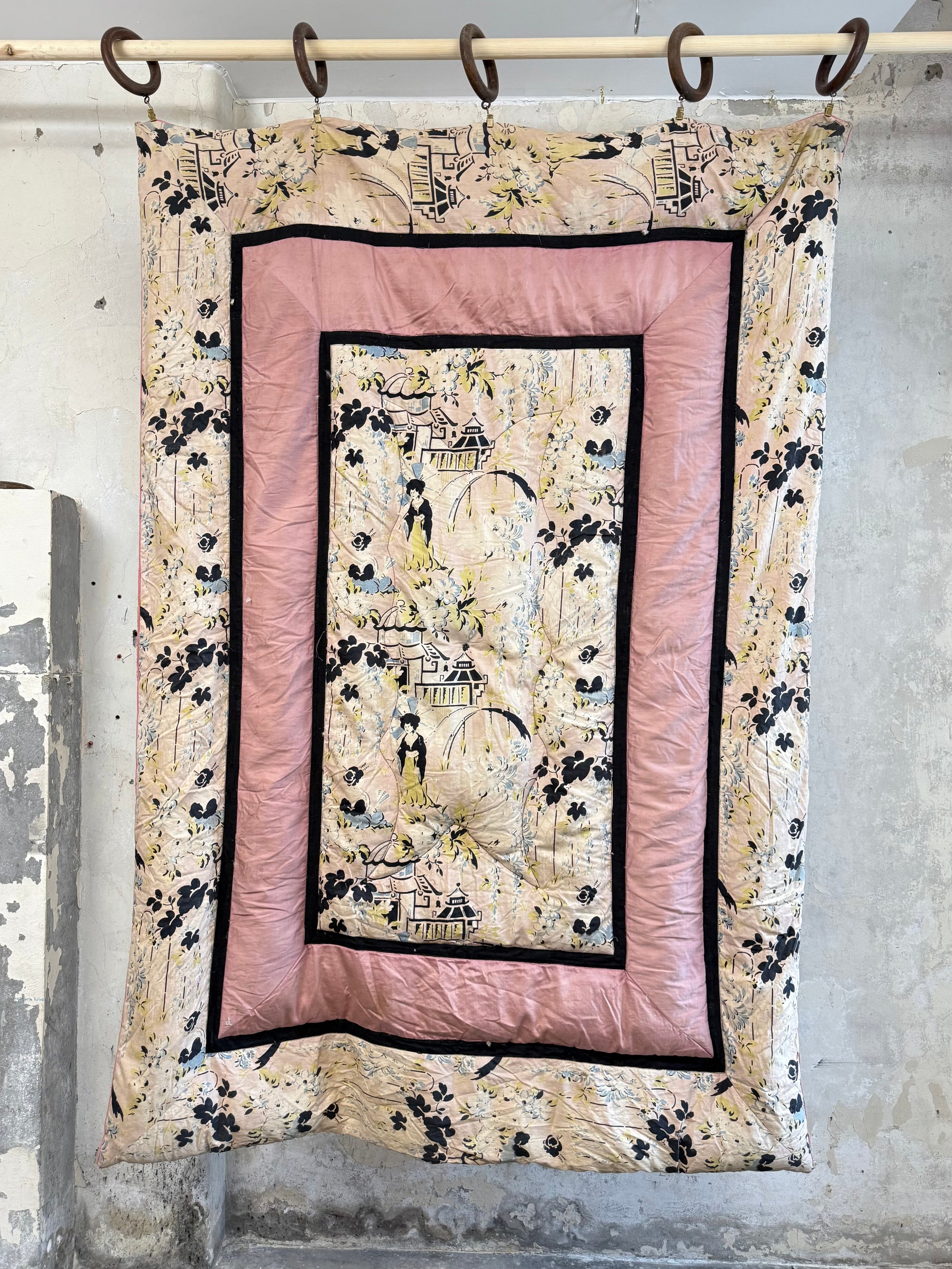 1930s duck feather eiderdown bed cover/quilt. Beautiful quilt in an unusual hand block printed chinoiserie pattern with pagodas, bridges, figures and floral elements. Double Faced with one side having the full pattern and the reverse having a ribboned contrasting pink fabric.