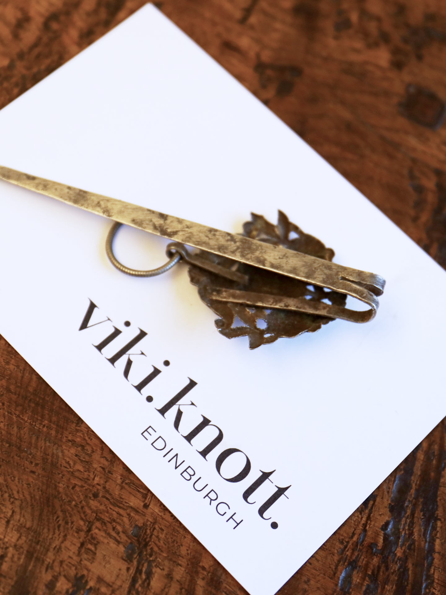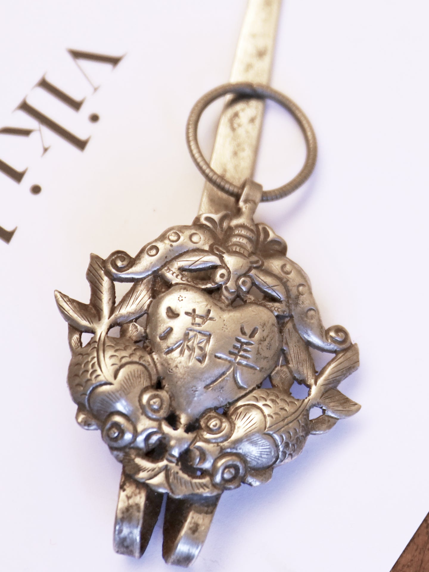 A late 19thC Chinese Hair or Hat Slide Ornament with heart featuring a double fish motif and engraved characters.