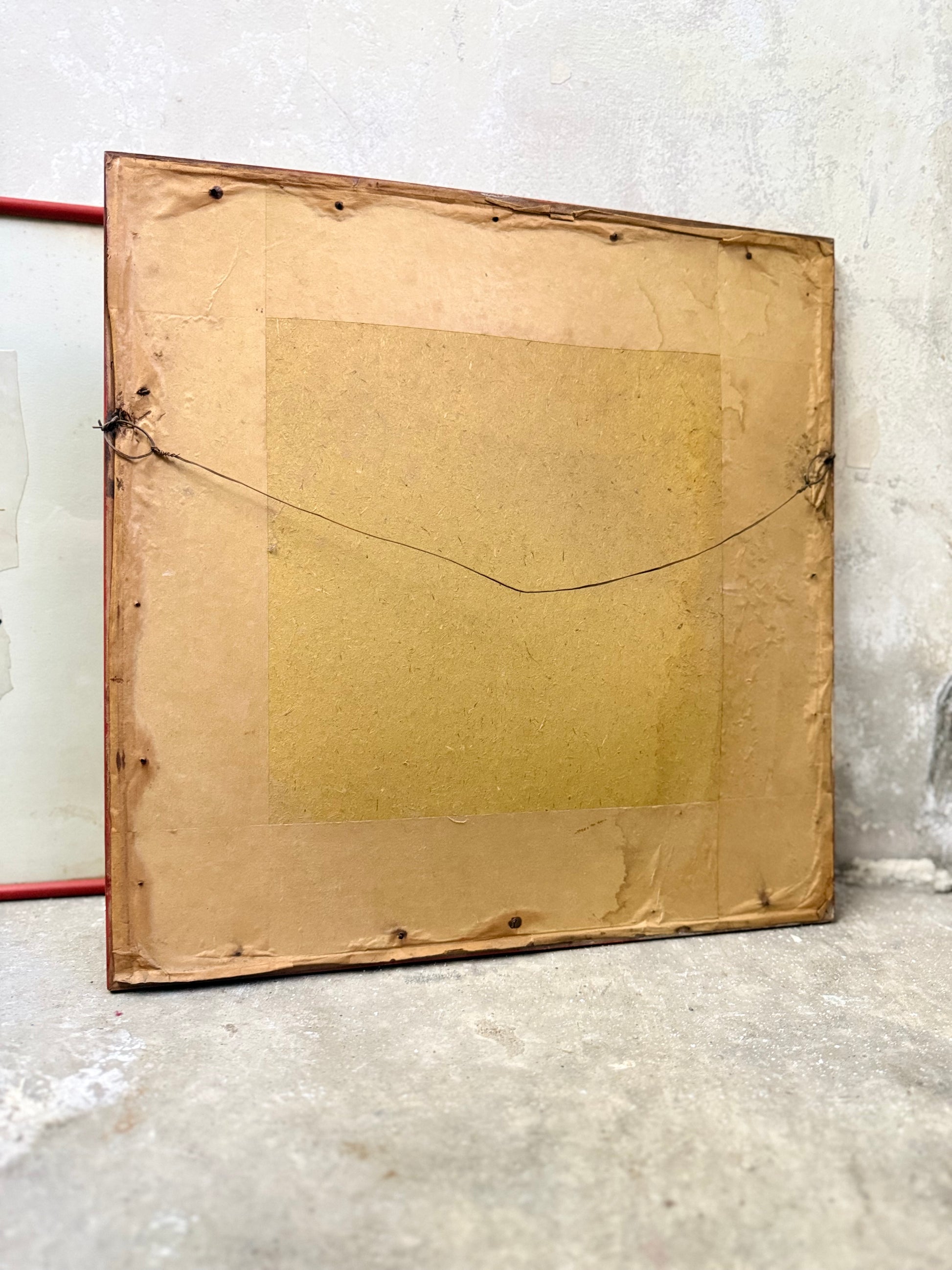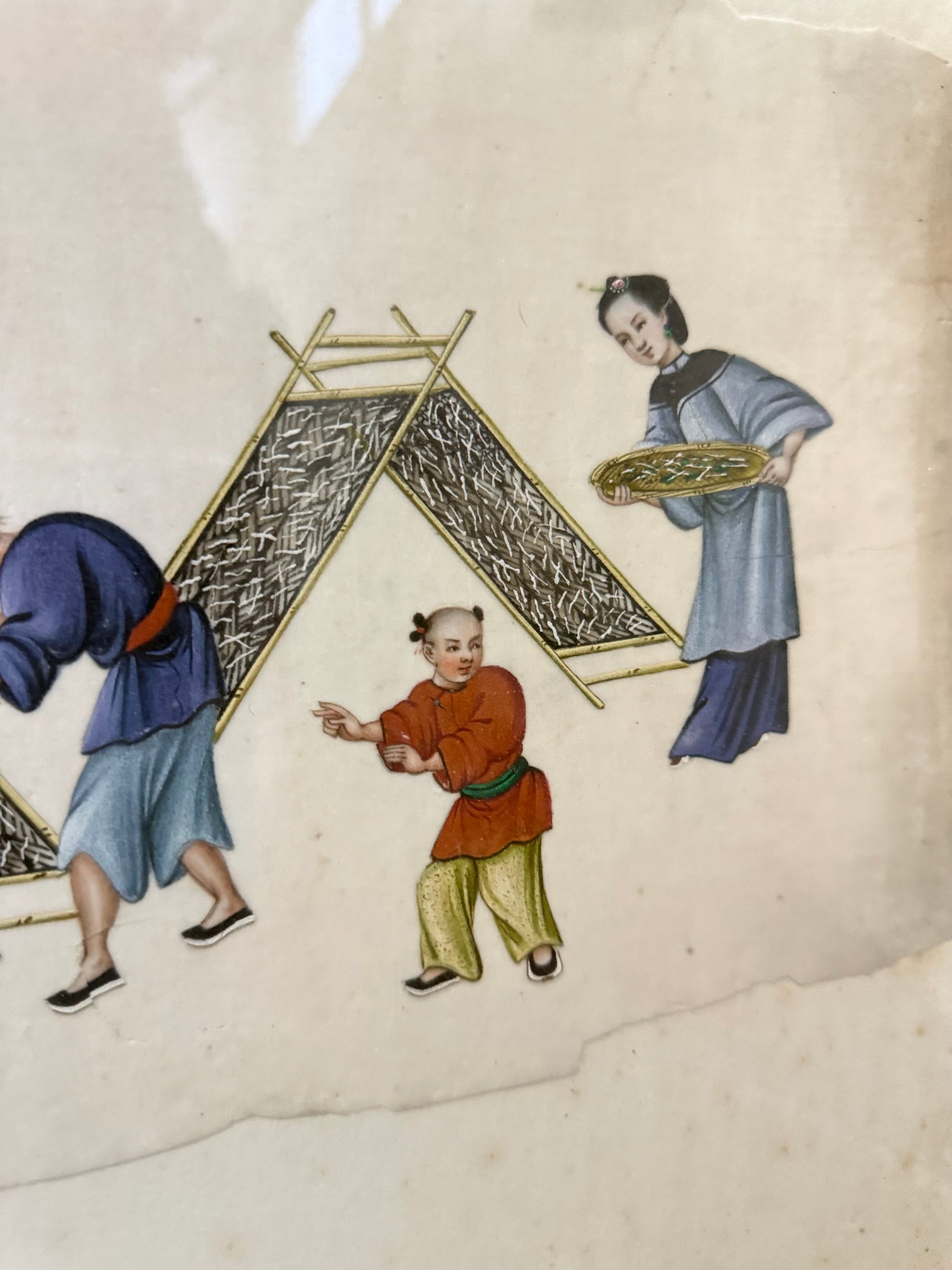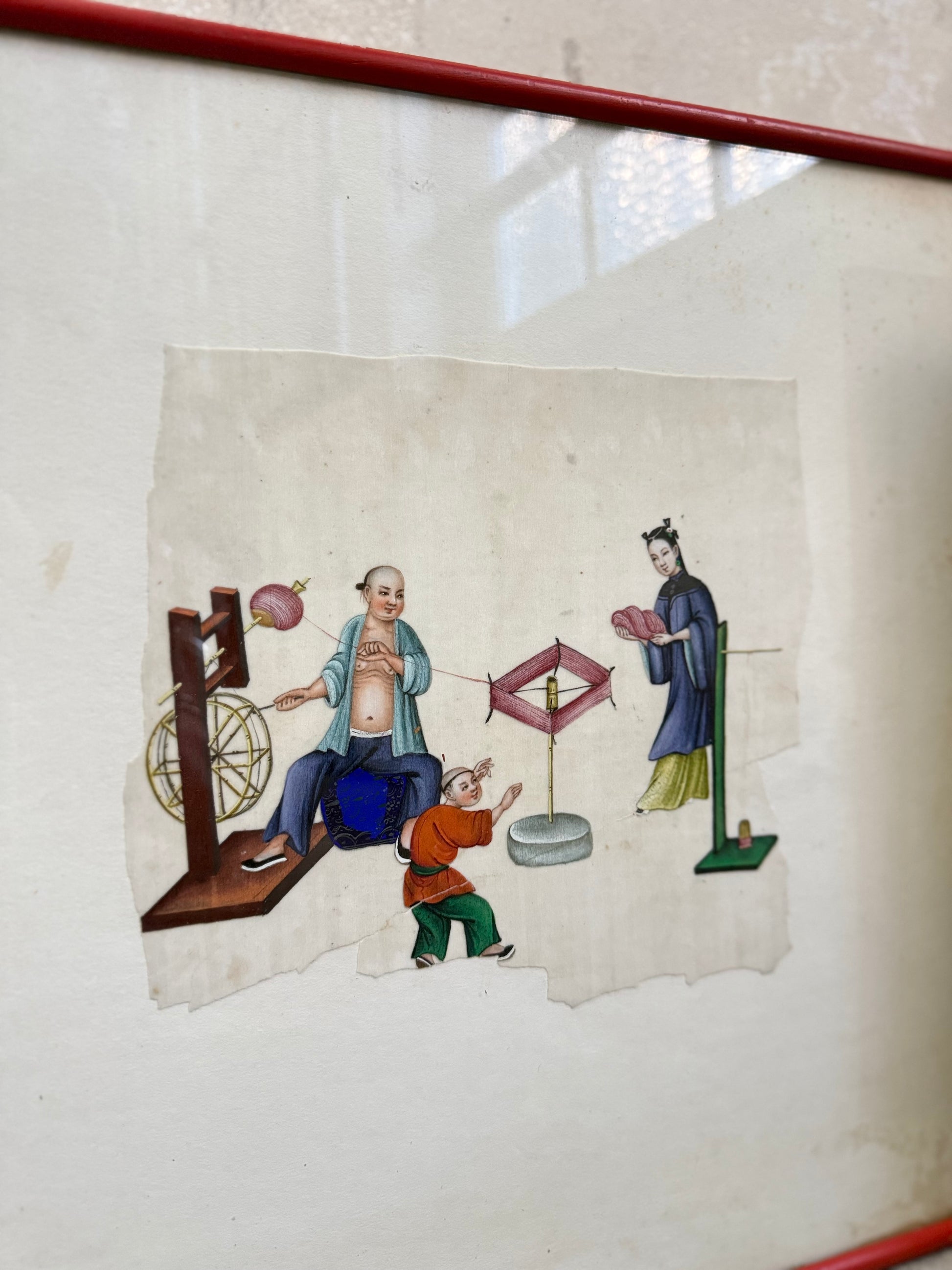 A pair of Chinese export watercolours on pith paper, depicting the process of silk production. The remnants of the original 19th Century paintings have been historically saved, backed and reframed in simple red frames during the first half of the 20th Century.