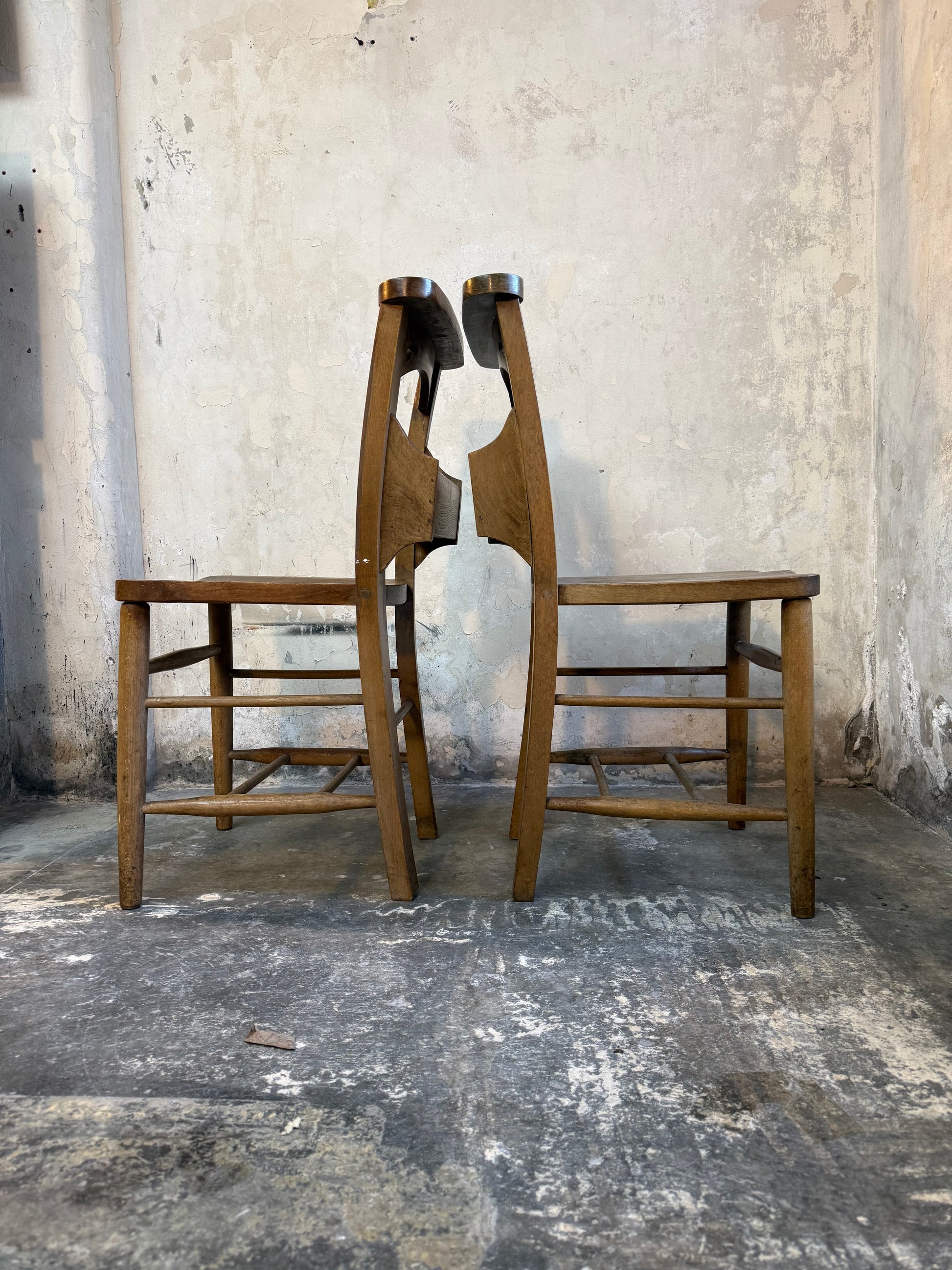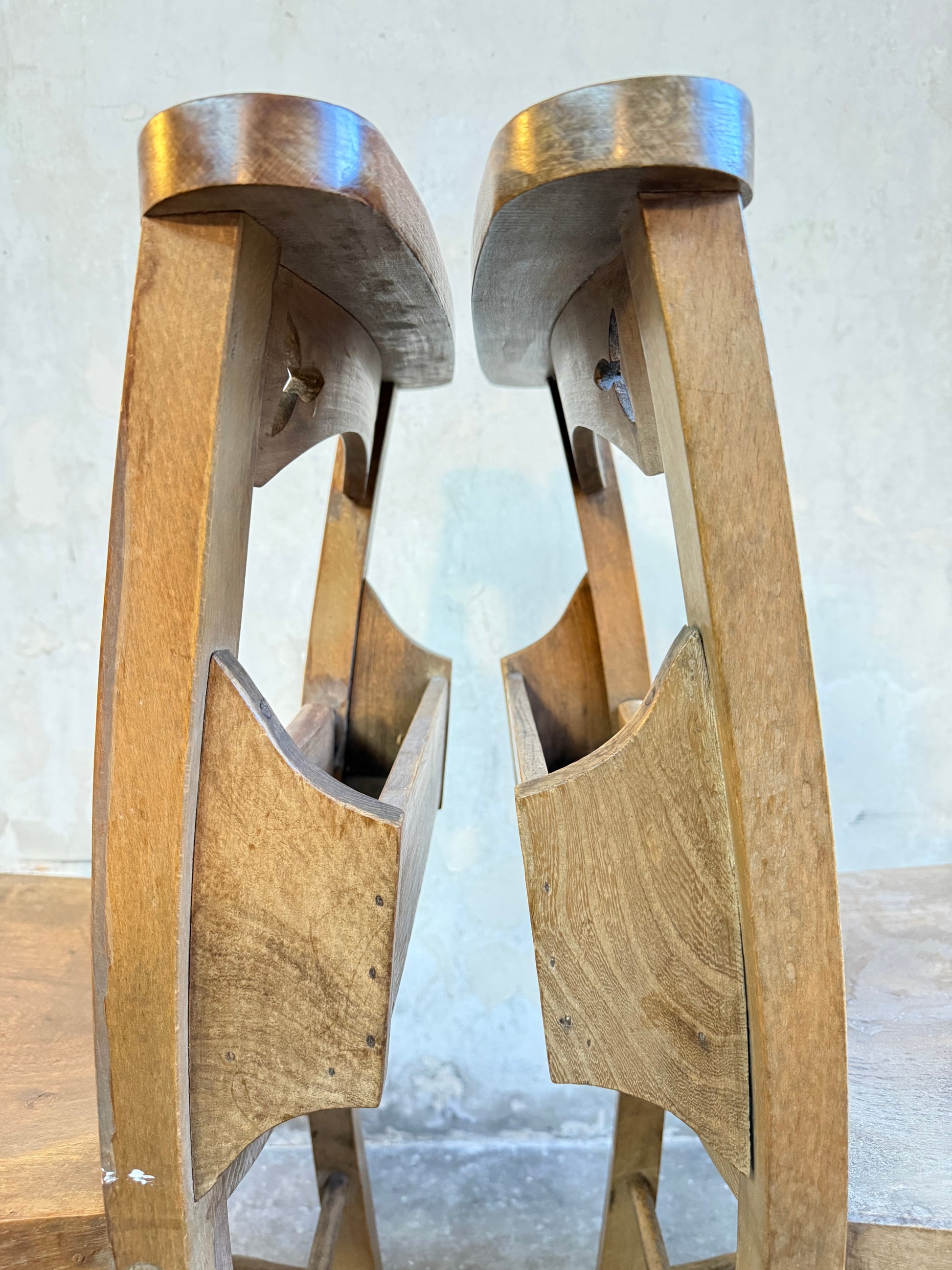A run of Elm & Beech Chapel chairs. With pierced trefoils to the curved backrest, book rack behind. Good colour.