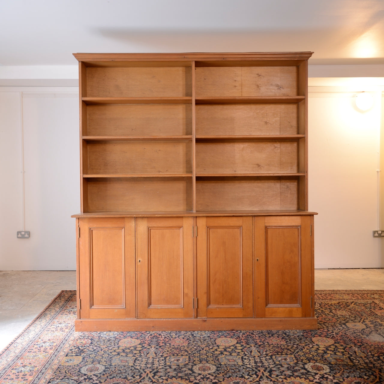 A large bookcase, the upper section having fixed open shelving in two sections.