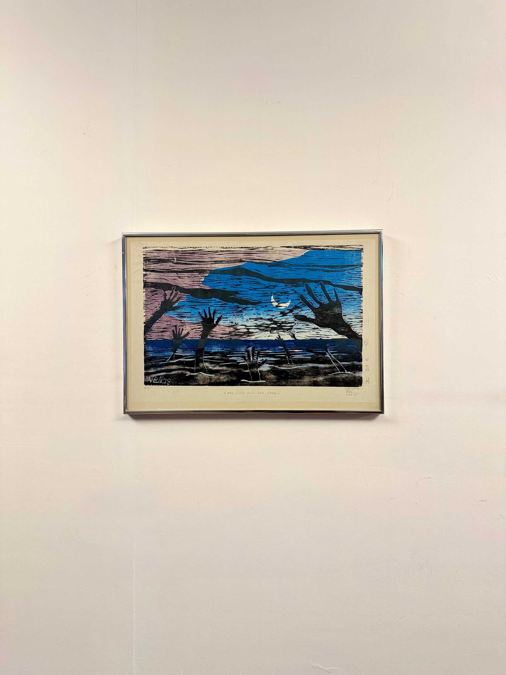 A usual surrealist type woodcut block print, titled Das Lied Von Der Erde ( The Song of the Earth). Signed and stamped W Bust Nielson, 1978-81.
