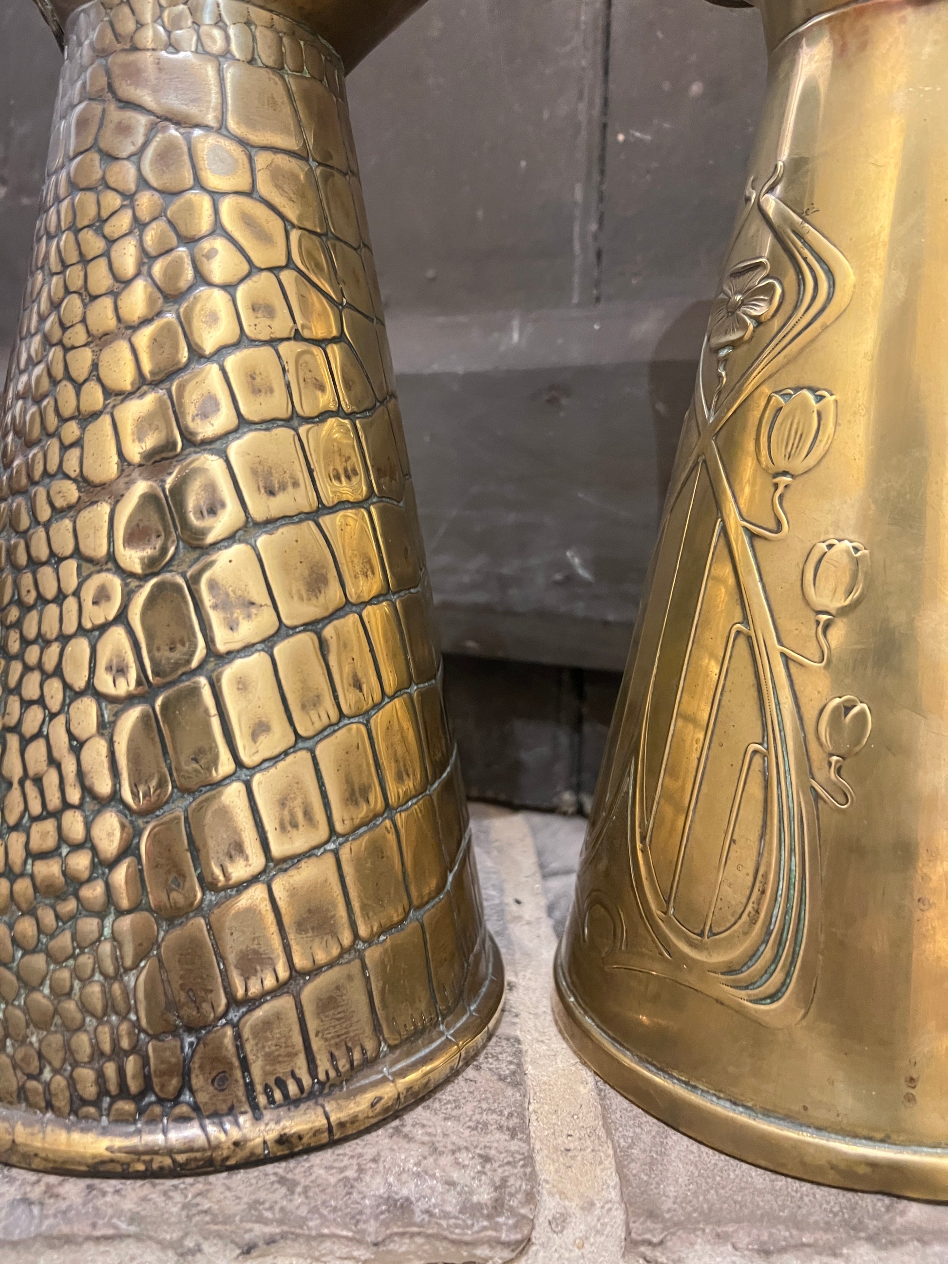 One with a hand-beaten reptile snakeskin pattern and the other featuring an Art Nouveau floral design.