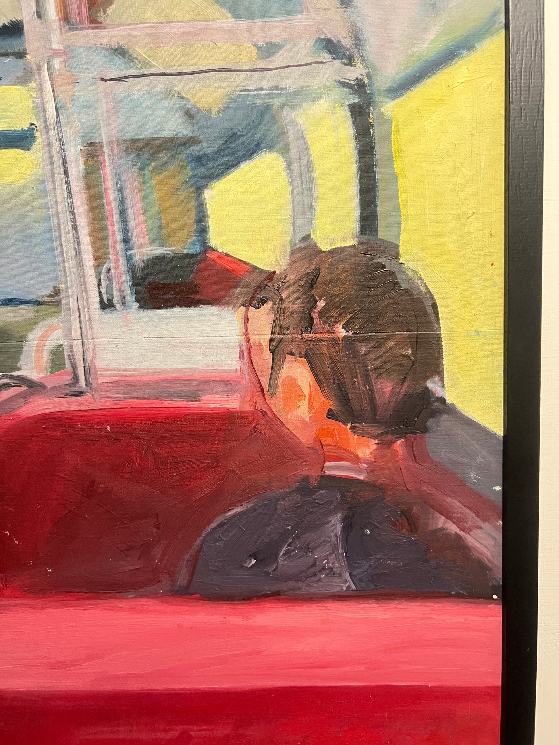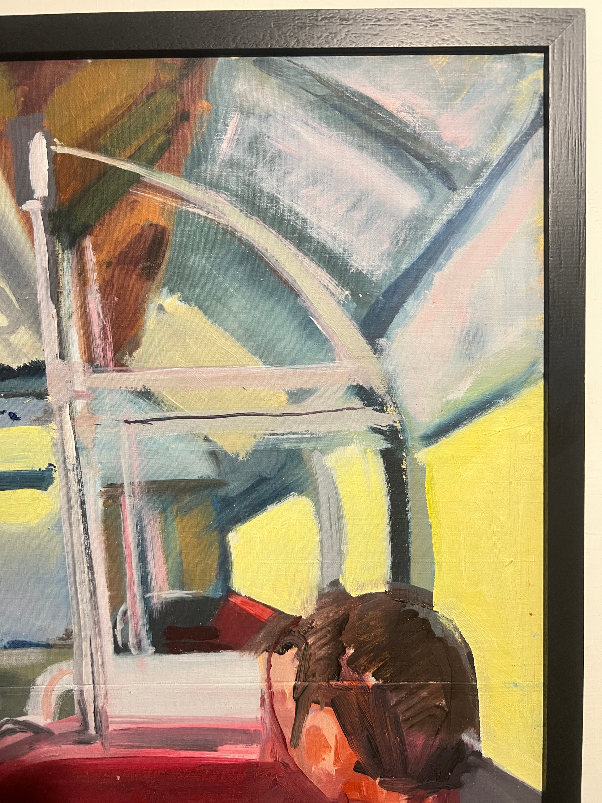 Original painting of tram or train interior.
