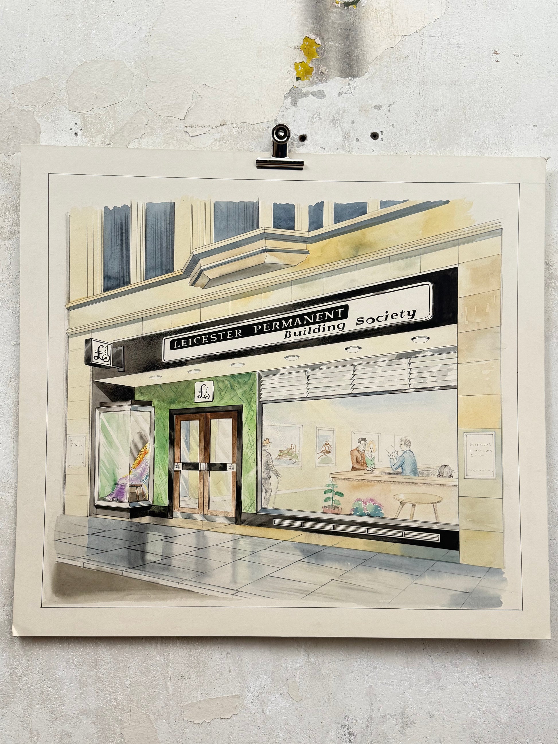 Architectural design and conceptual draft and drawing of a Leicester Permanent Building Society branch facade.
