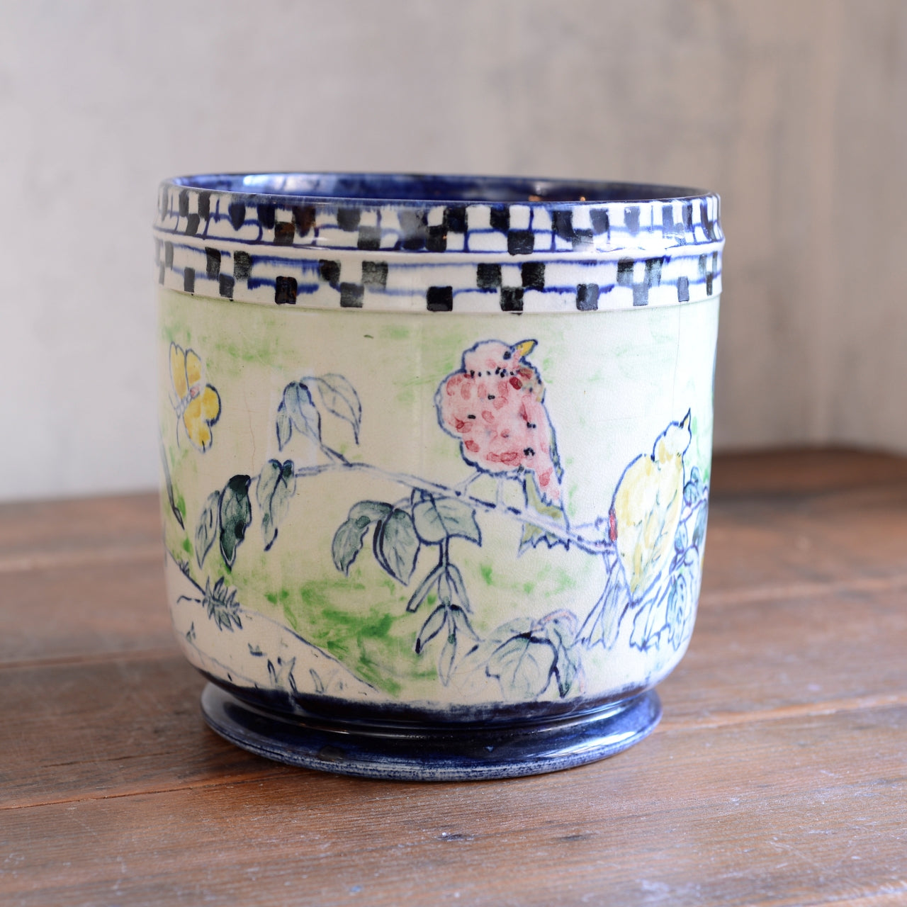 A Scottish pottery jardiniere by M.R. Steel of tapered form with moulded band checker board top decorated in polychrome enamels with bull rushes, butterflies and birds signed verso and dated 1916: Interesting provenance sticker on base, Exhibited at Glasgow Institute of Fine Art