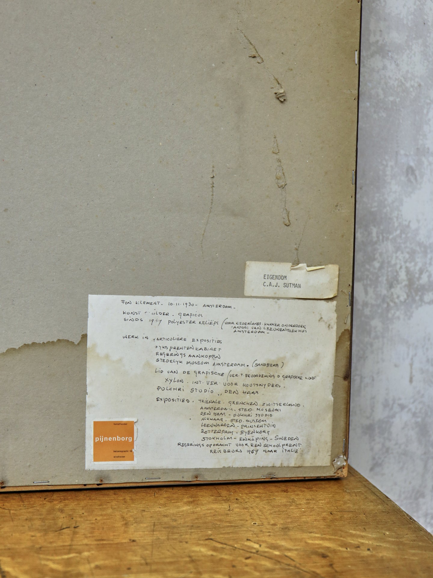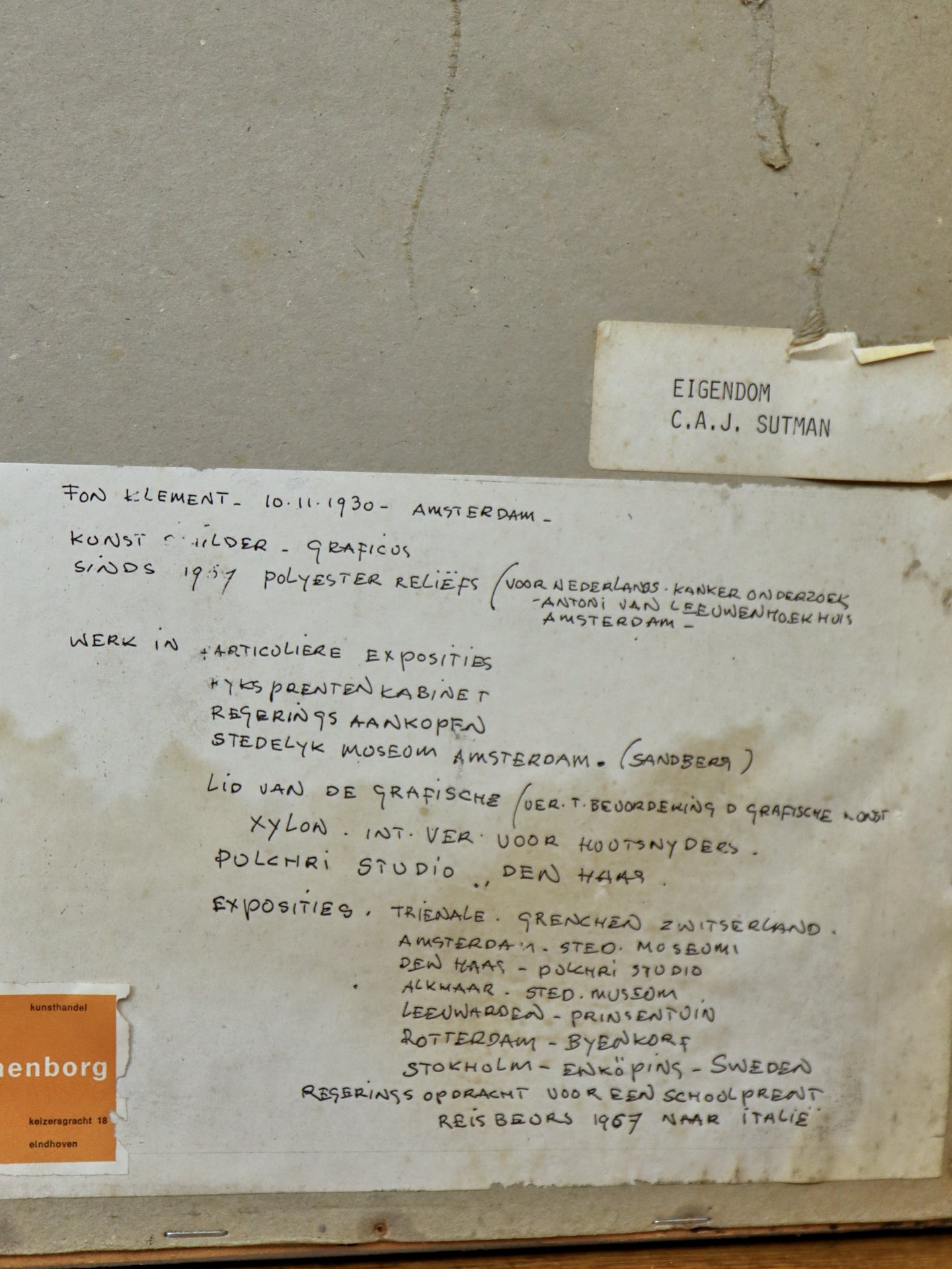 Fon Klement was born in Amsterdam, he was a self taught artist mostly known for his hardboard cuts. He also worked as a painter, draftsman, muralist, and sculptor. Klement lived and worked in Amsterdam and France and studied in Sweden for a while. Klement found inspiration in the work of Kirchner, Permeke, Chabot, Kruyder, Rouault and Beckman. In the seventies his work became more and more abstract.These abstract works brought him public recognition. Later he started working in brighter colors and returned to figurative subjects, mostly flowers which he painted while staying in his French studio. Klement’s work was part of a large traveling exhibit of Dutch artists in the US and an overview of his work was exhibited in Museum Van Bommel-Van Dam in Venlo. He was also featured in the Singer Museum in Laren. He received several awards and numerous publications about his works have been published over time.