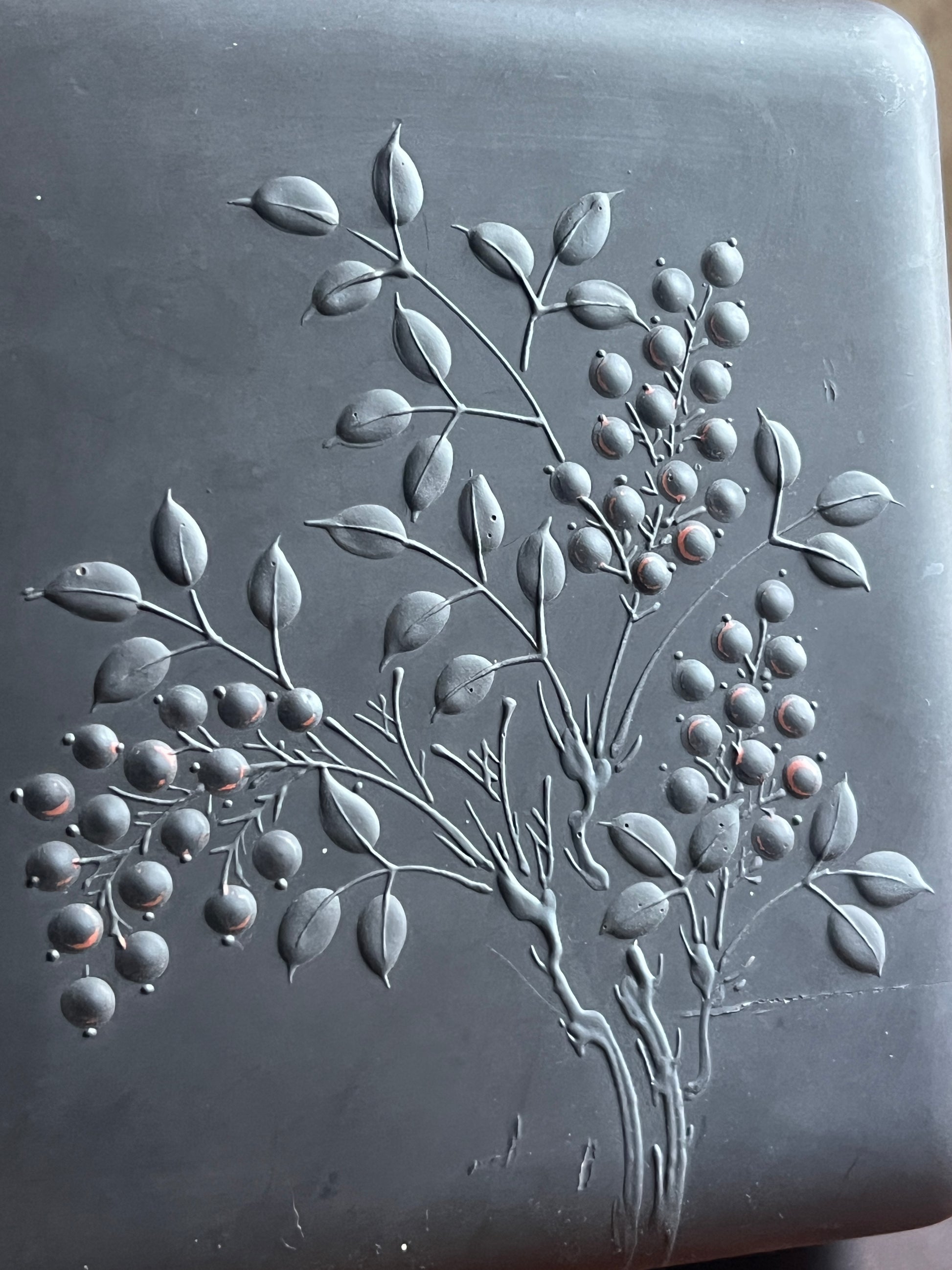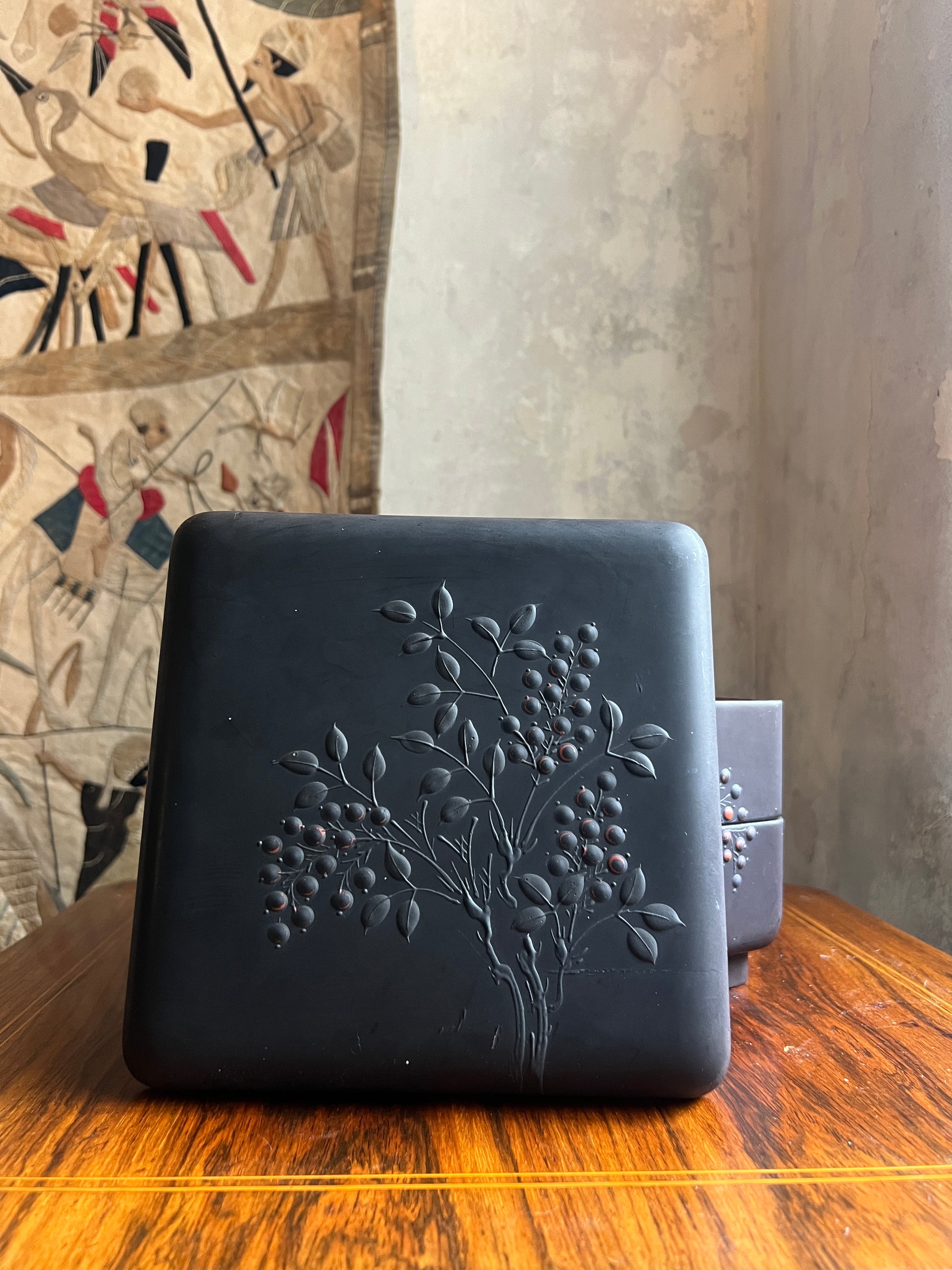 The two-layer lacquered box is decorated on different sides with traditional symbols of Japanese plants and a bright red lacquered interior.