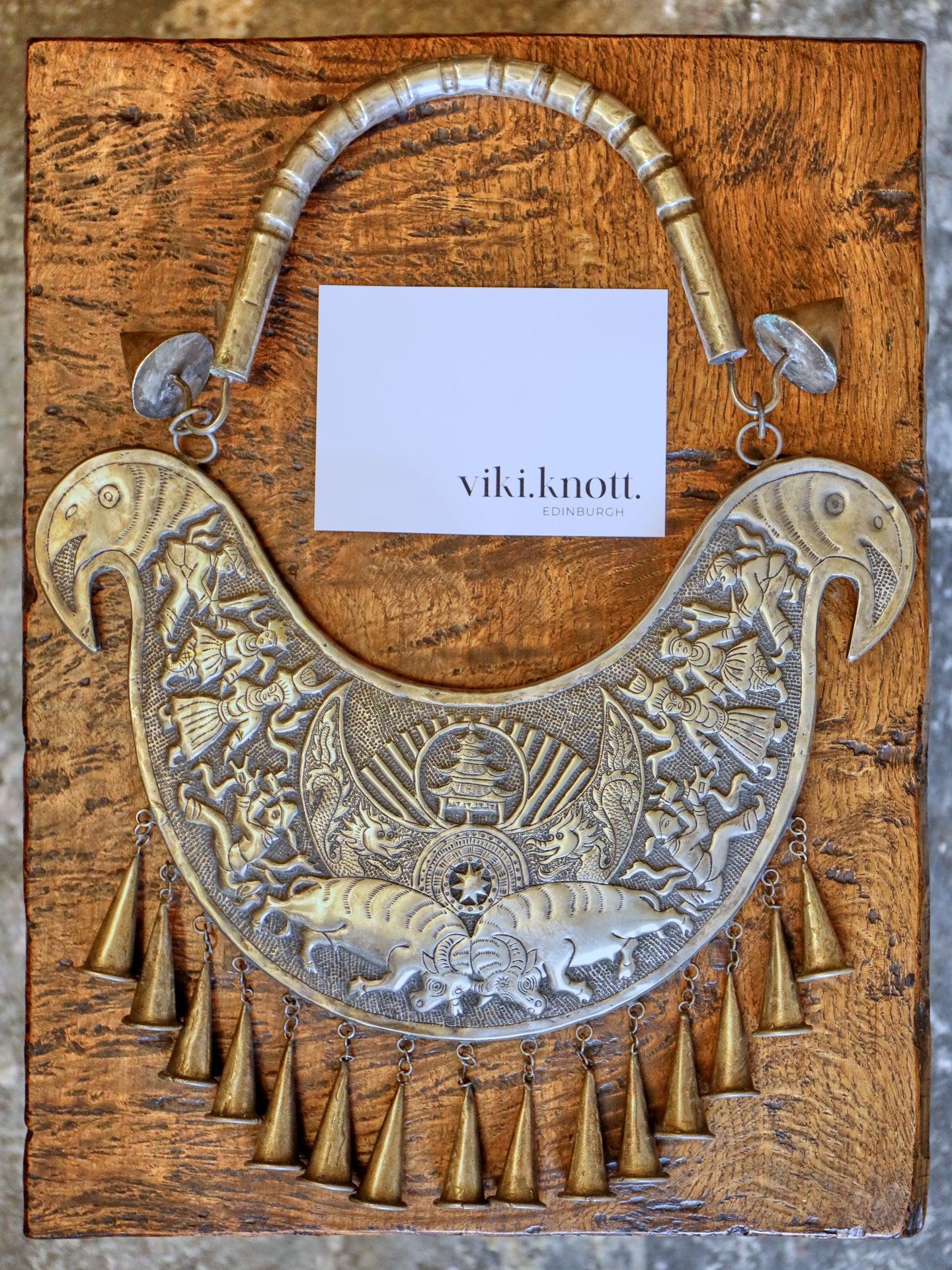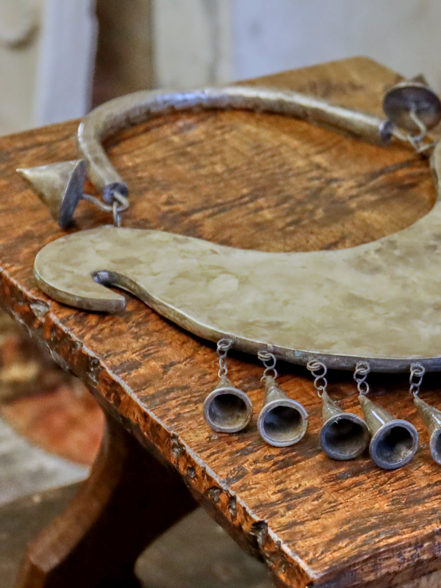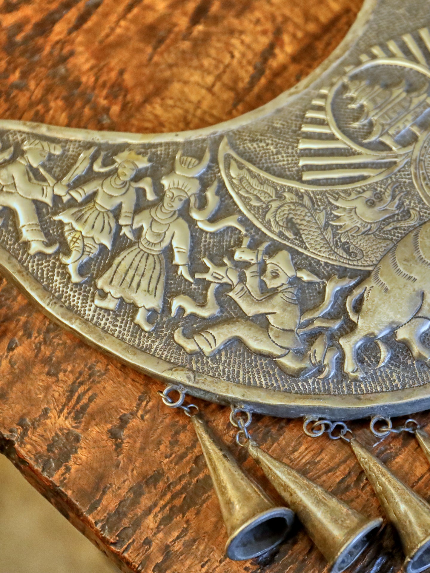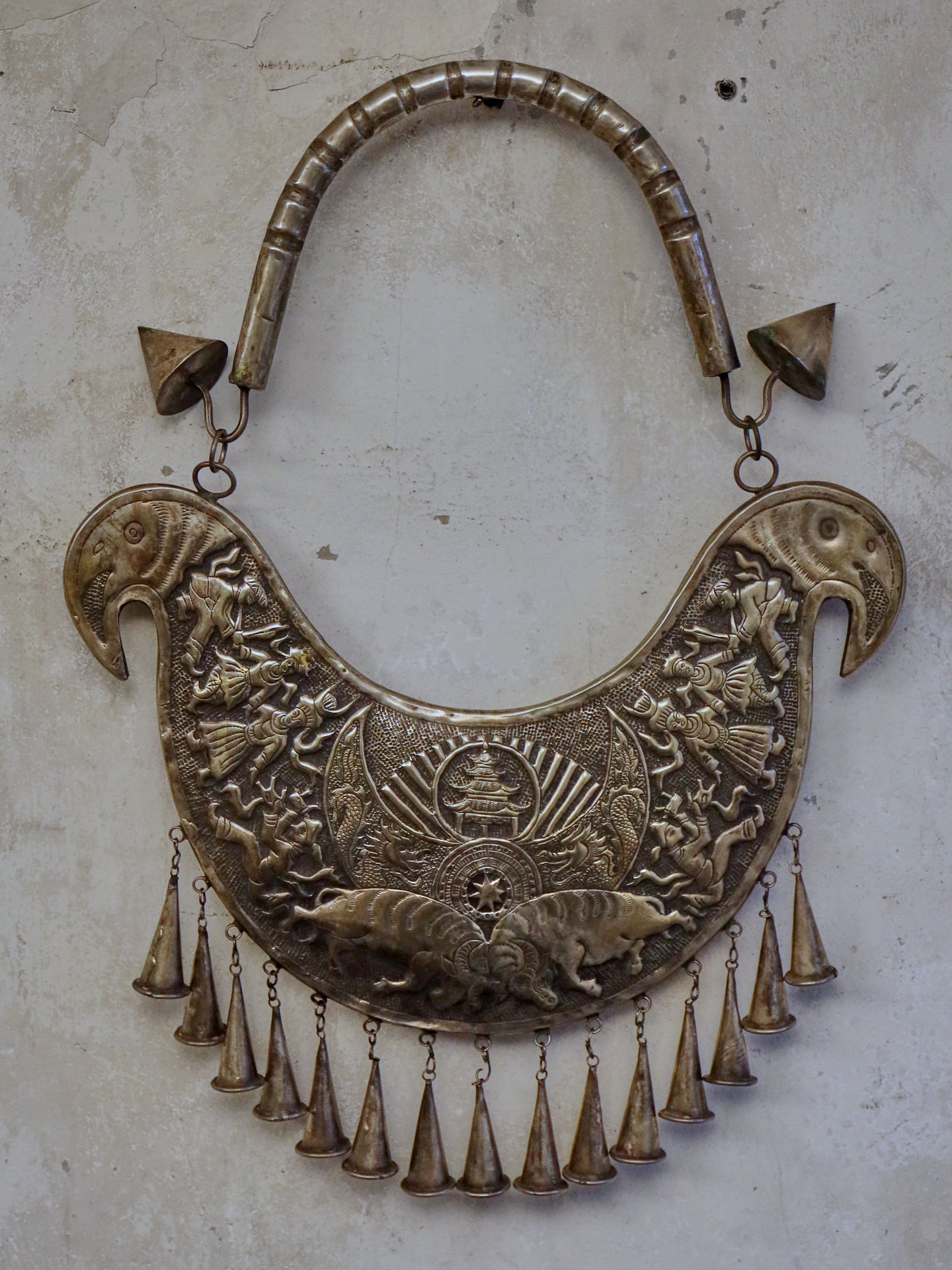 Chinese Miao Silvered Metal large curved engraved pendant with two parrot head finials. The pendant is engraved with people, animals, dragons, cow horns, foliage, and a house. The pendant is suspended from a tube like necklace, and at the base of the pendant, are fifteen tubular bell pendants.