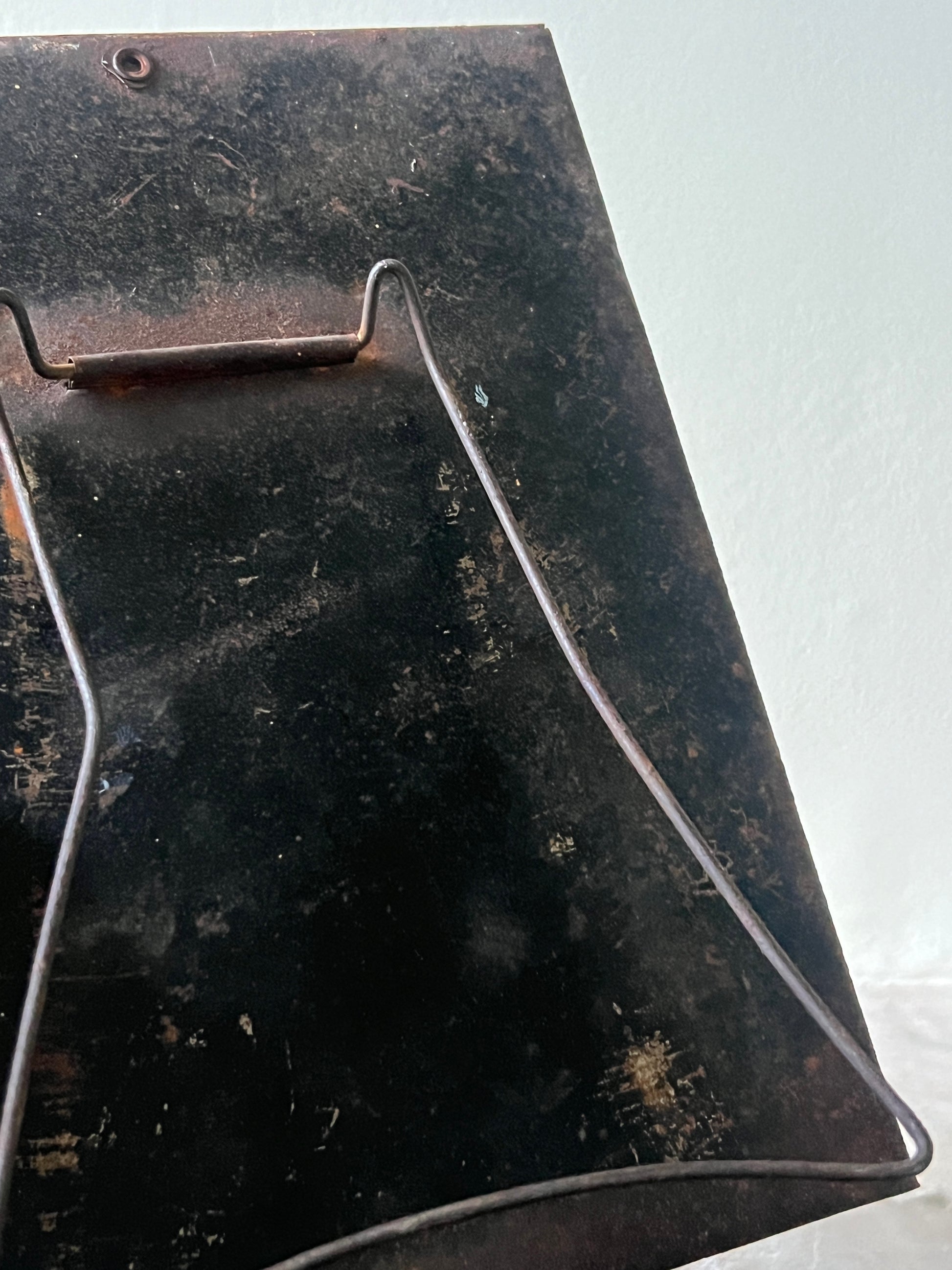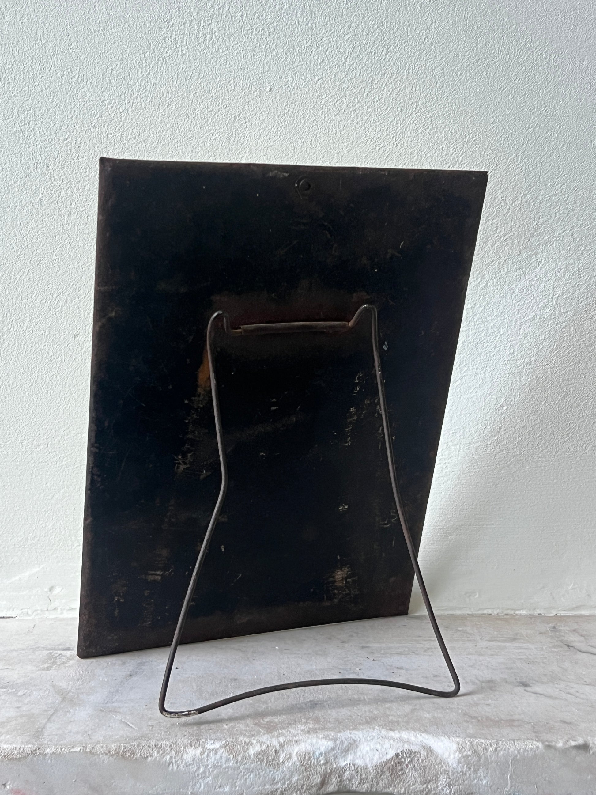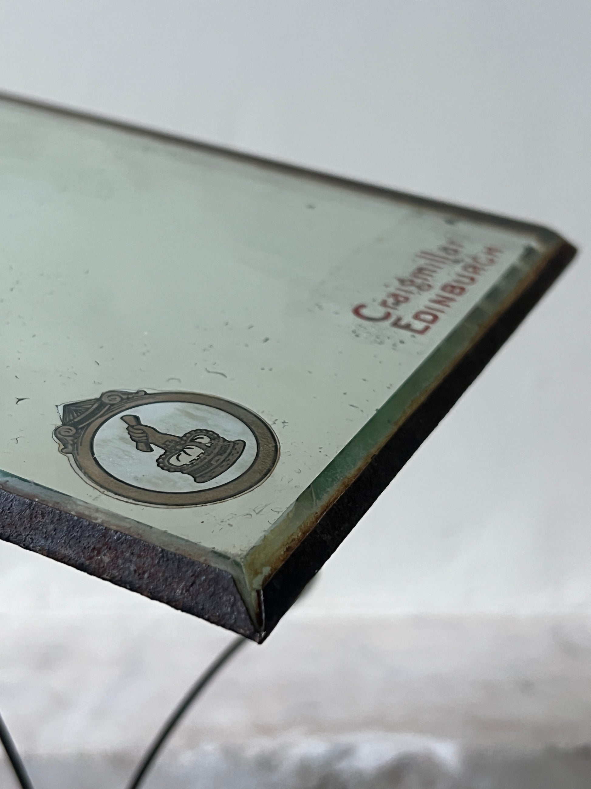 Rectangular bevelled mirror plate with original sign writing and toleware mount with wire trestle.
