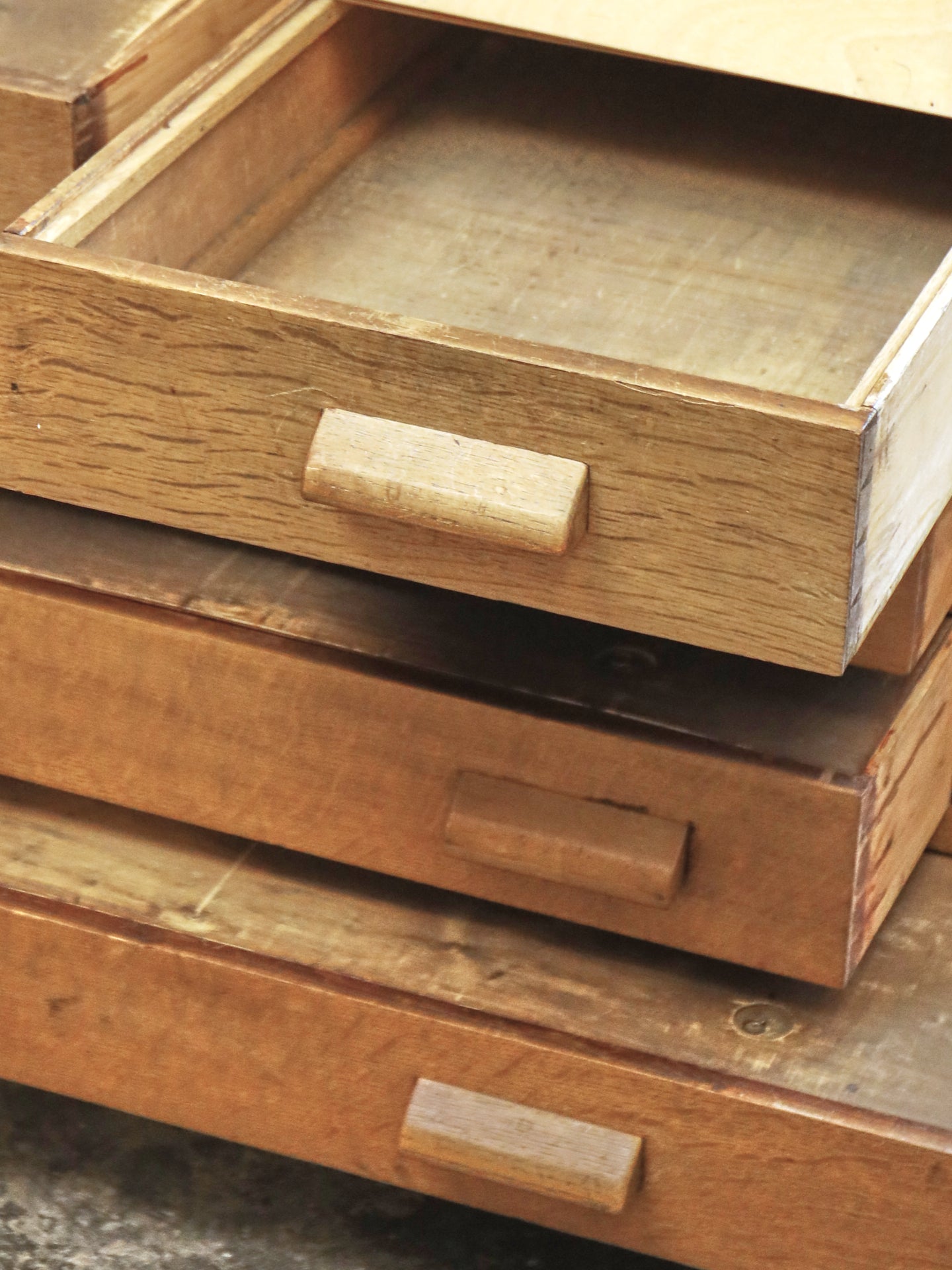 Two short drawers of differing lengths over two long with a large full length folio drawer to the base. Each drawer has an inner flip top dust cover.