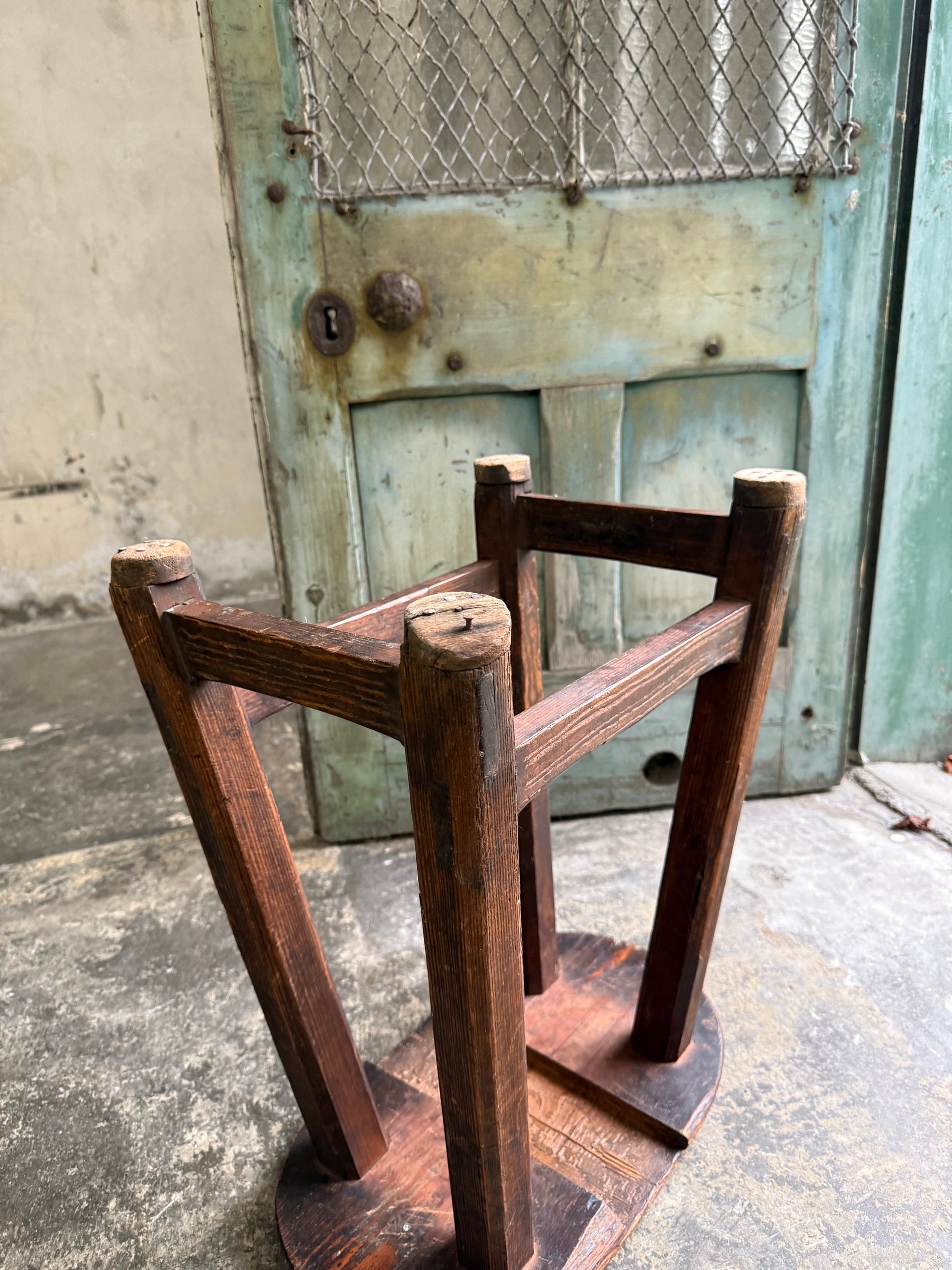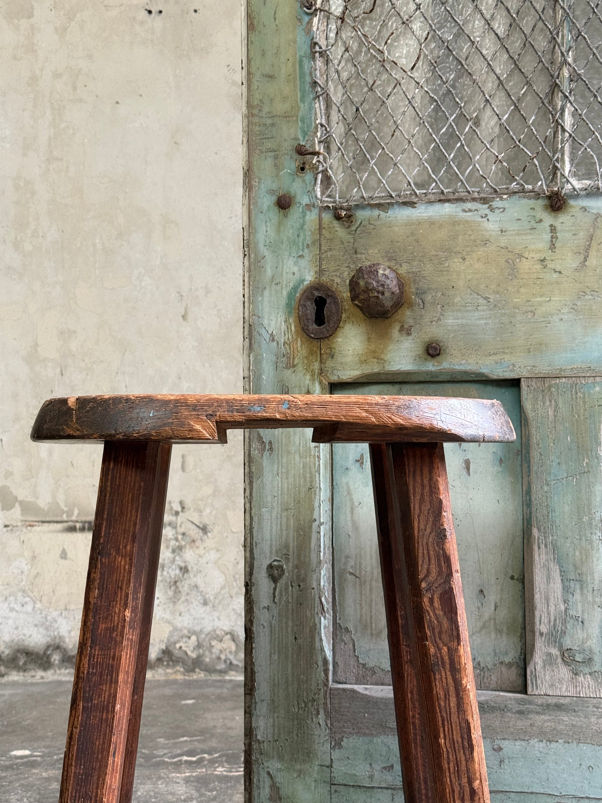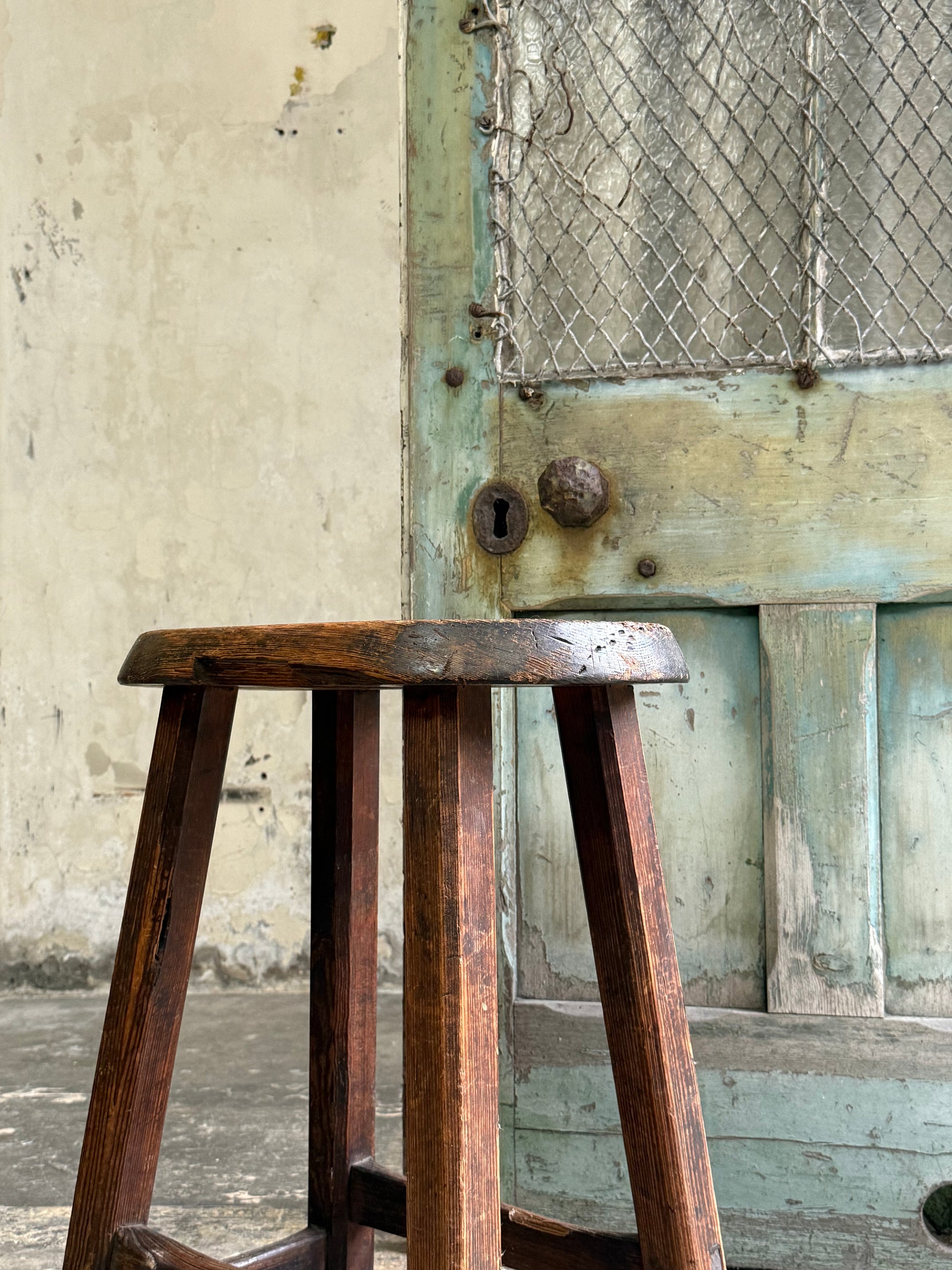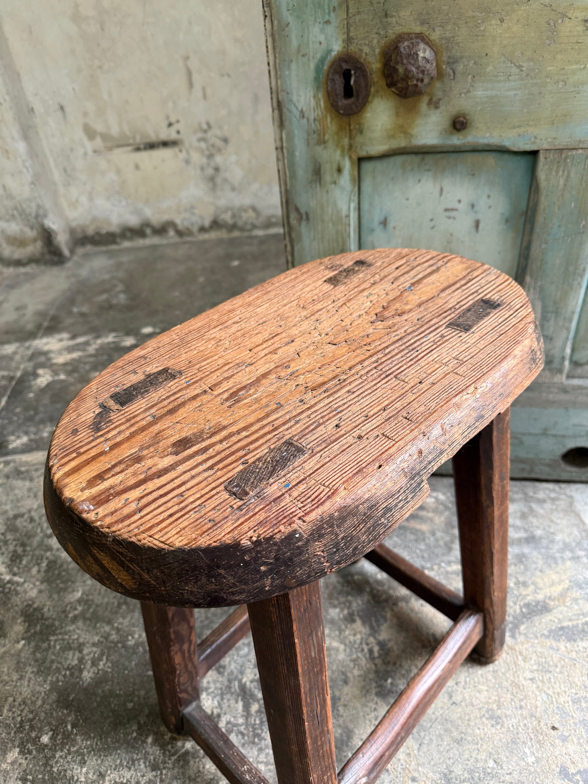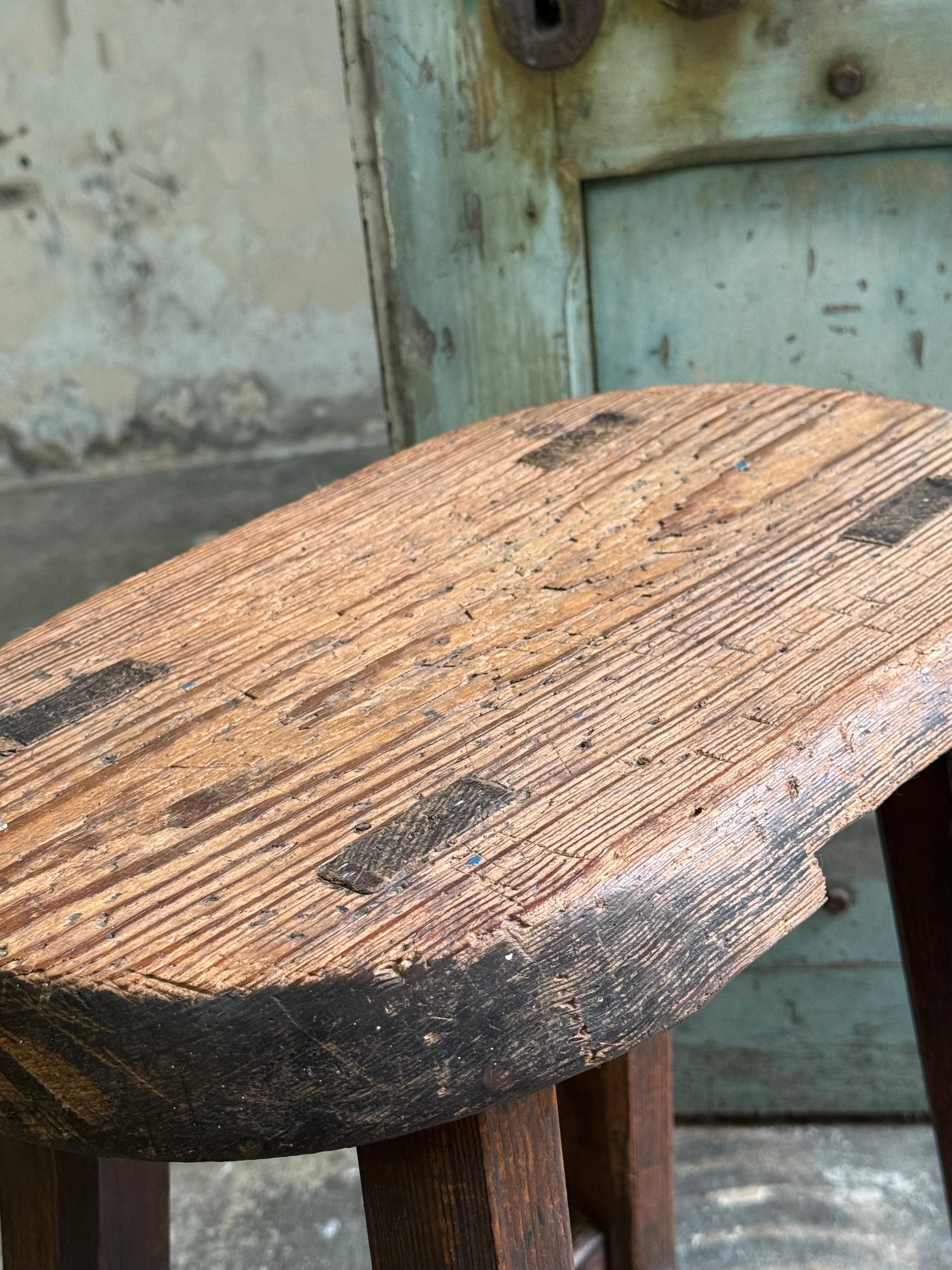 A Pitch Pine Stool with oval seat. Sturdy construction with various historic repairs and height adjustments. Interestingly a wedge has been cut out the base, possibly for the stool to be slid onto a fixed stand to prevent movement in a factory, church or school.