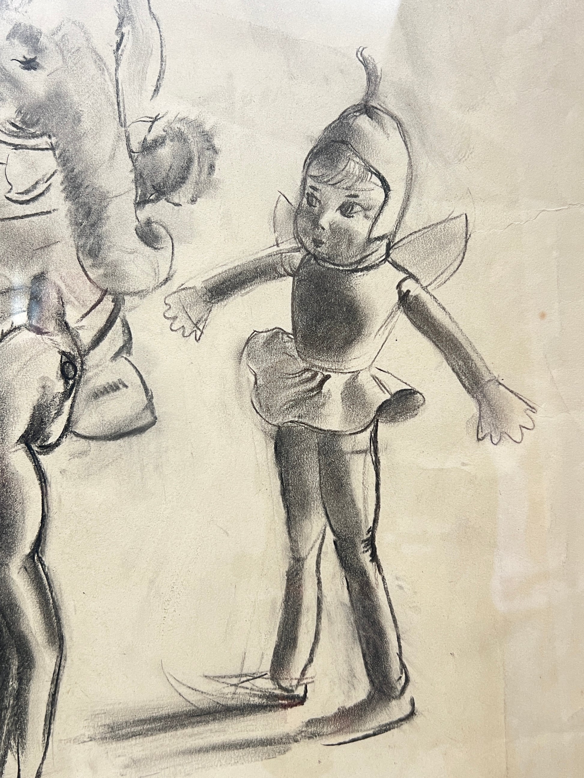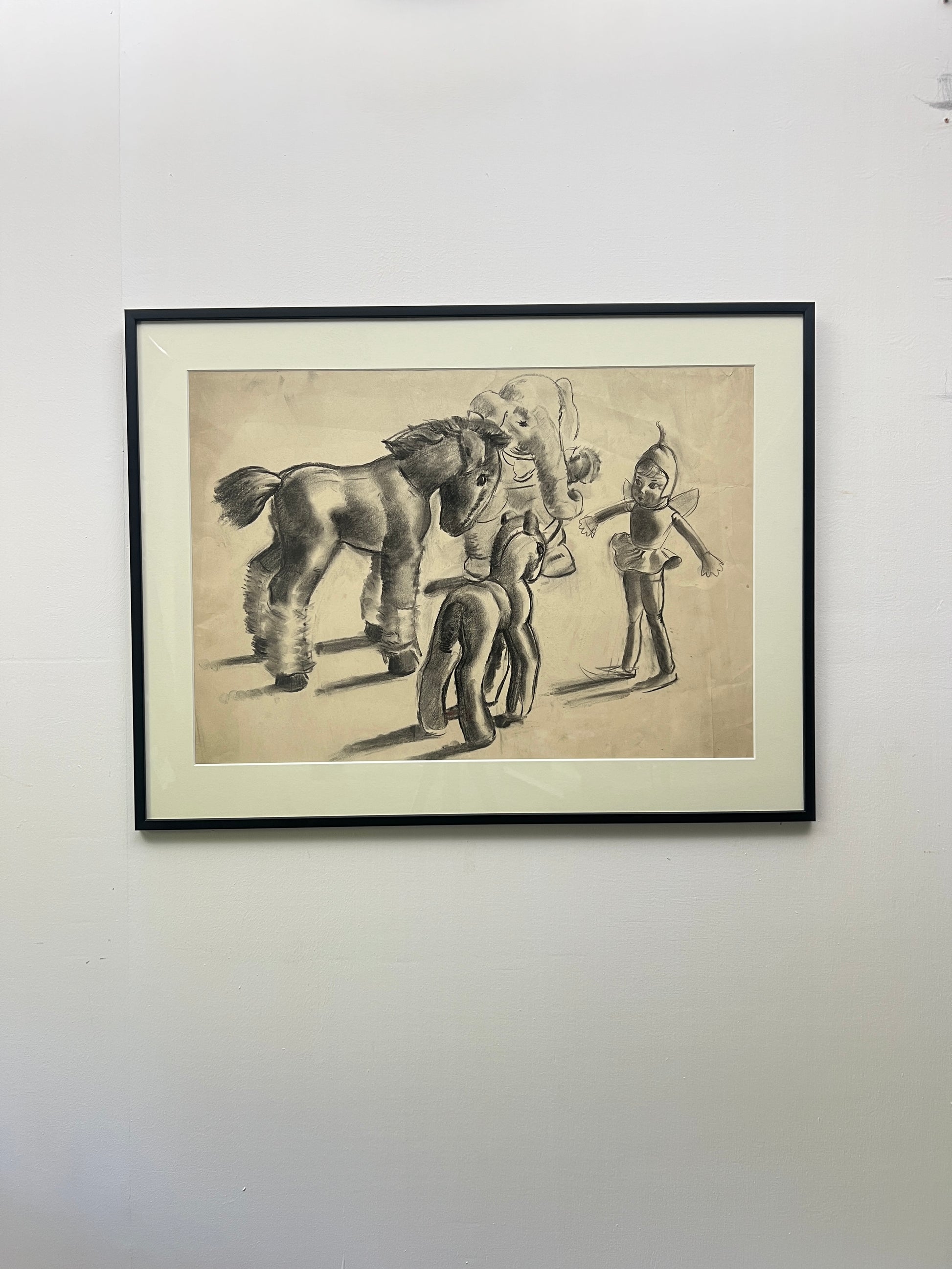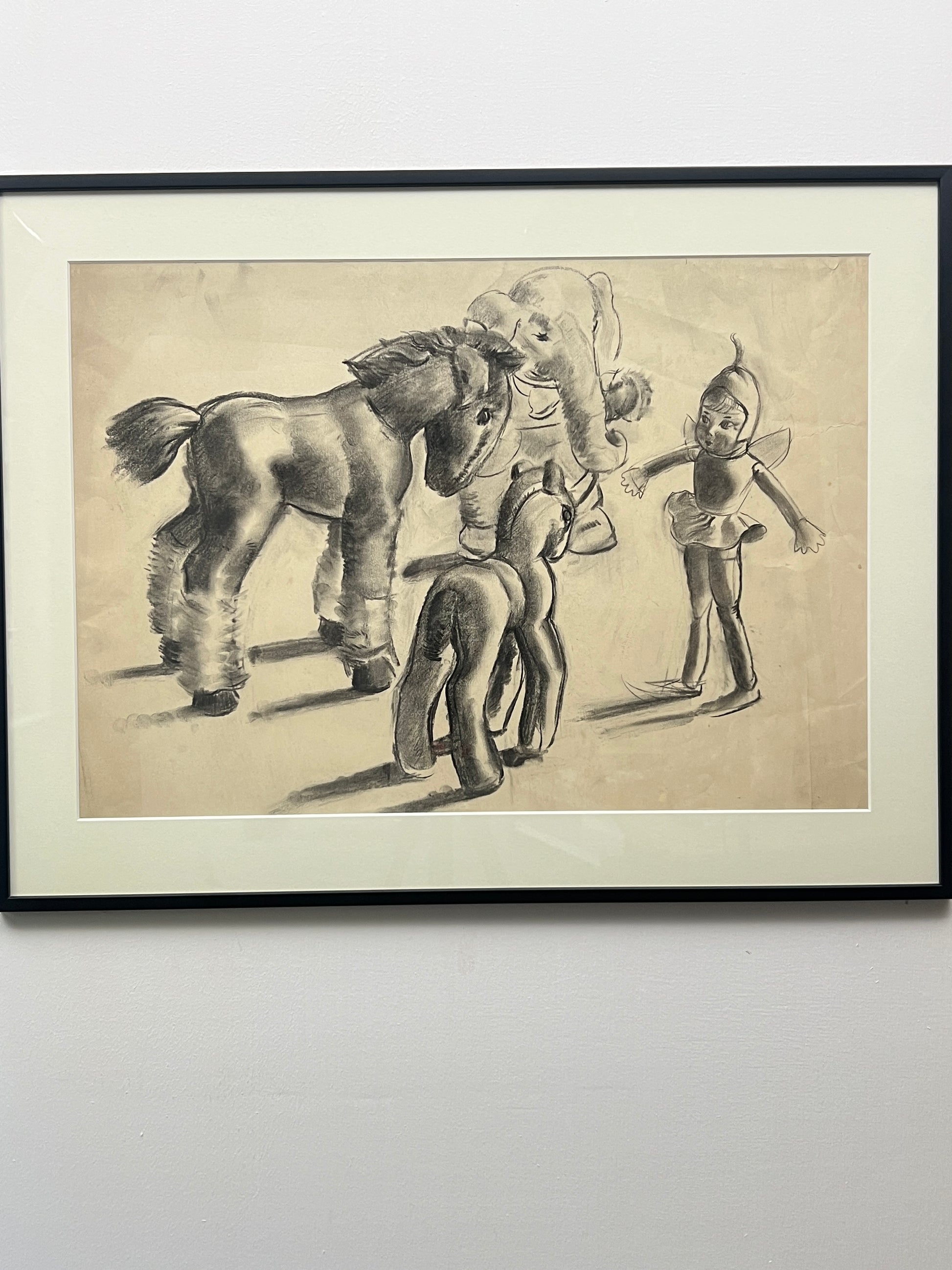 A beautifully imagined and extremely well executed graphite on paper study of three toy animals with a fairy doll.