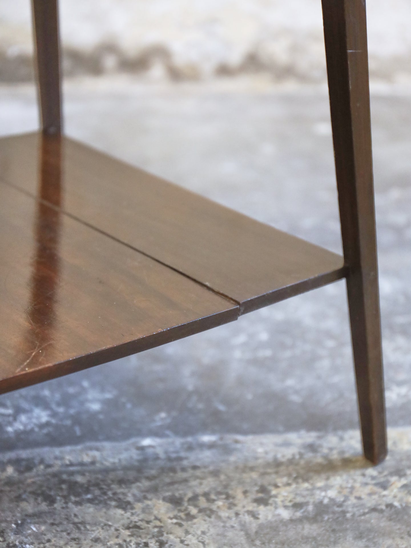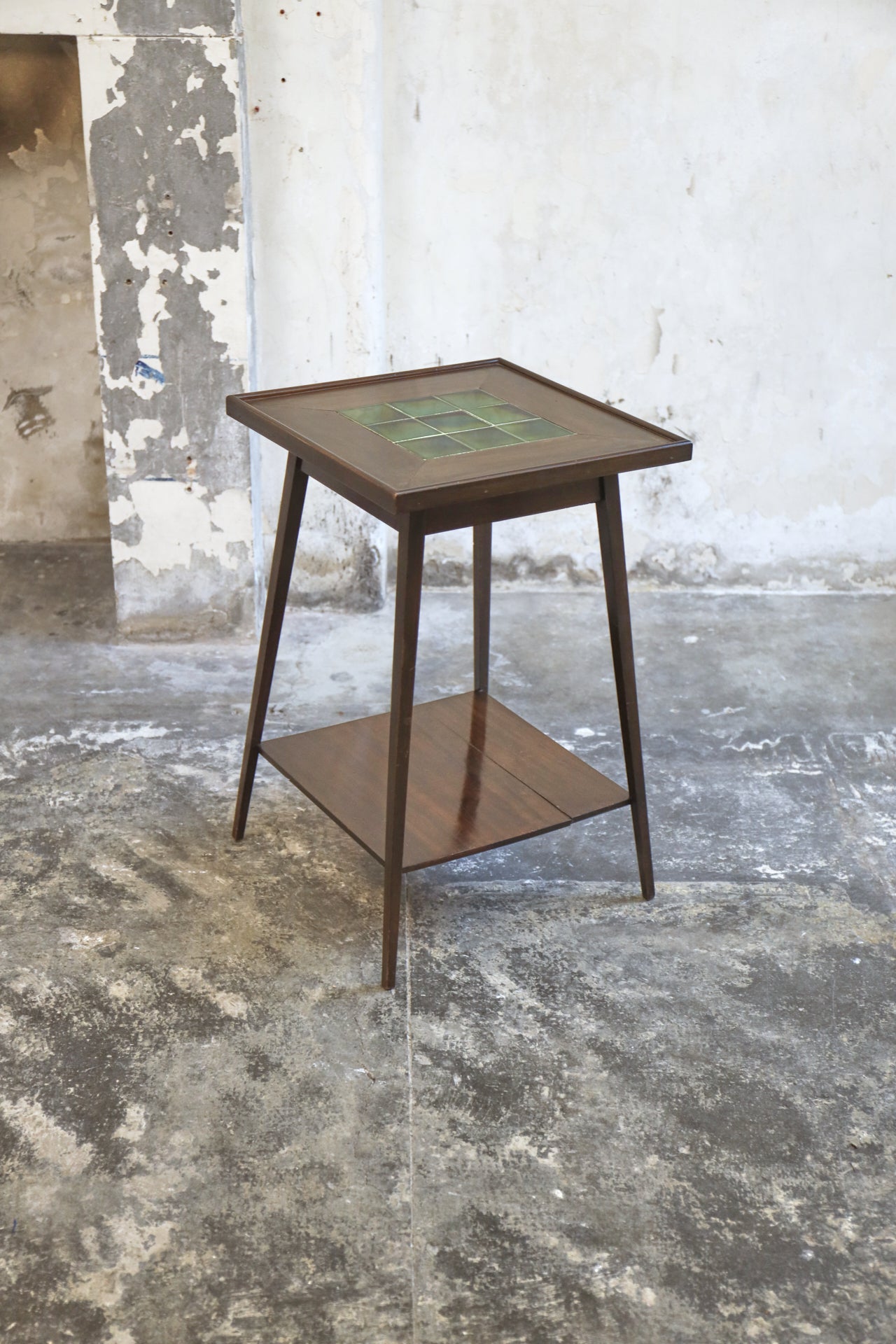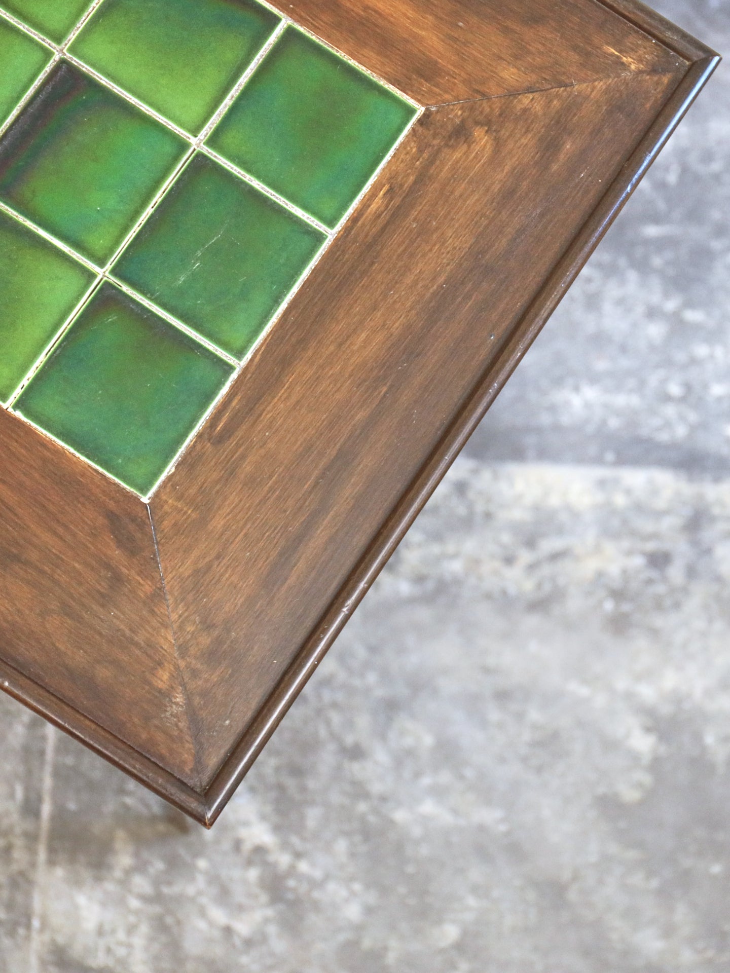 An arts and crafts table with tapering square leg, green majolica inset tiled top and lower shelf.
