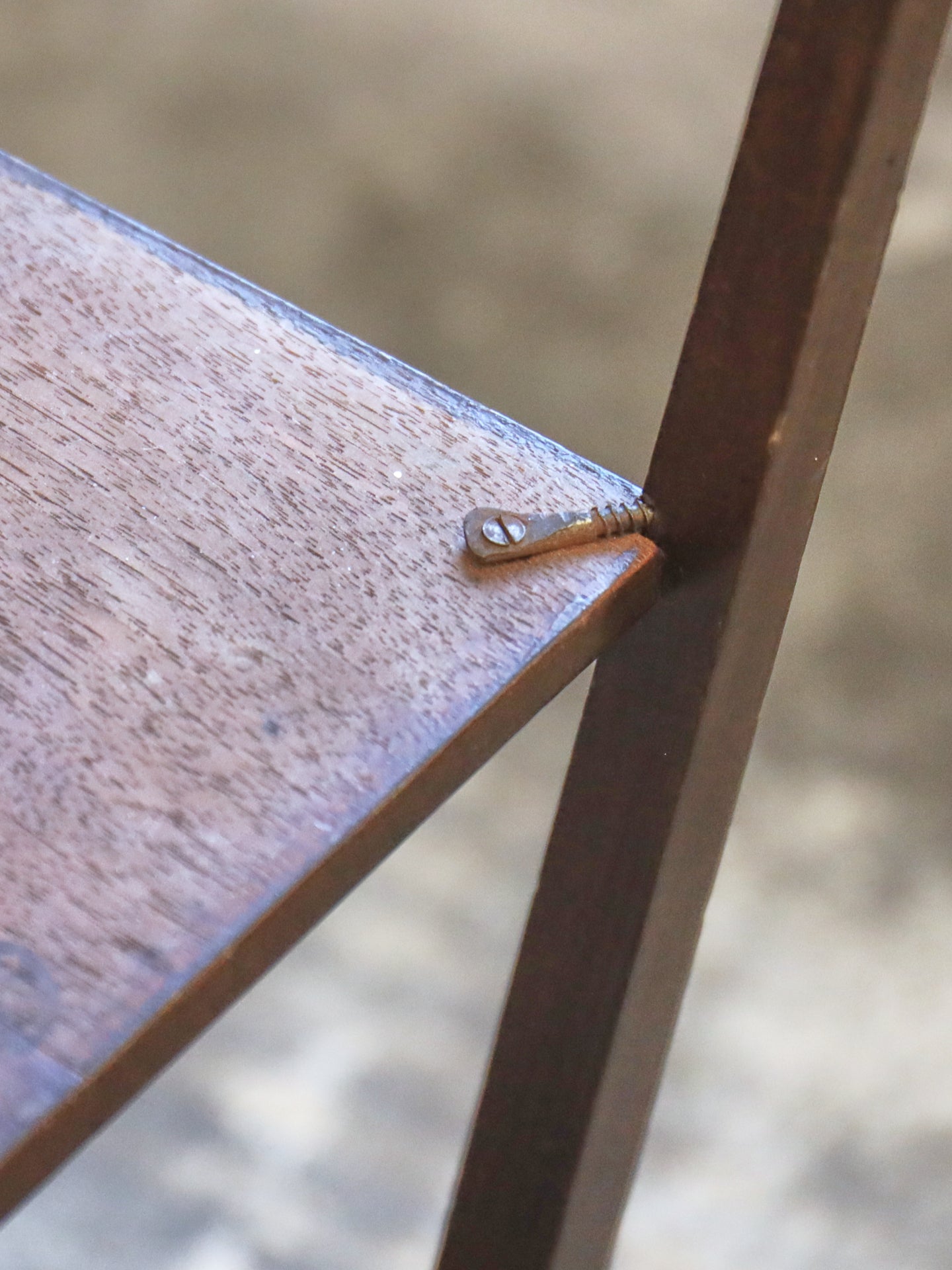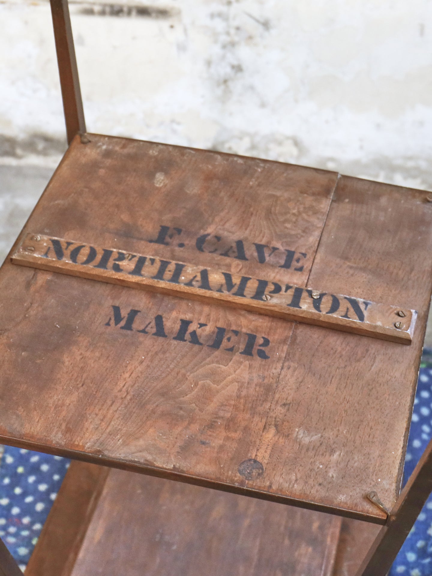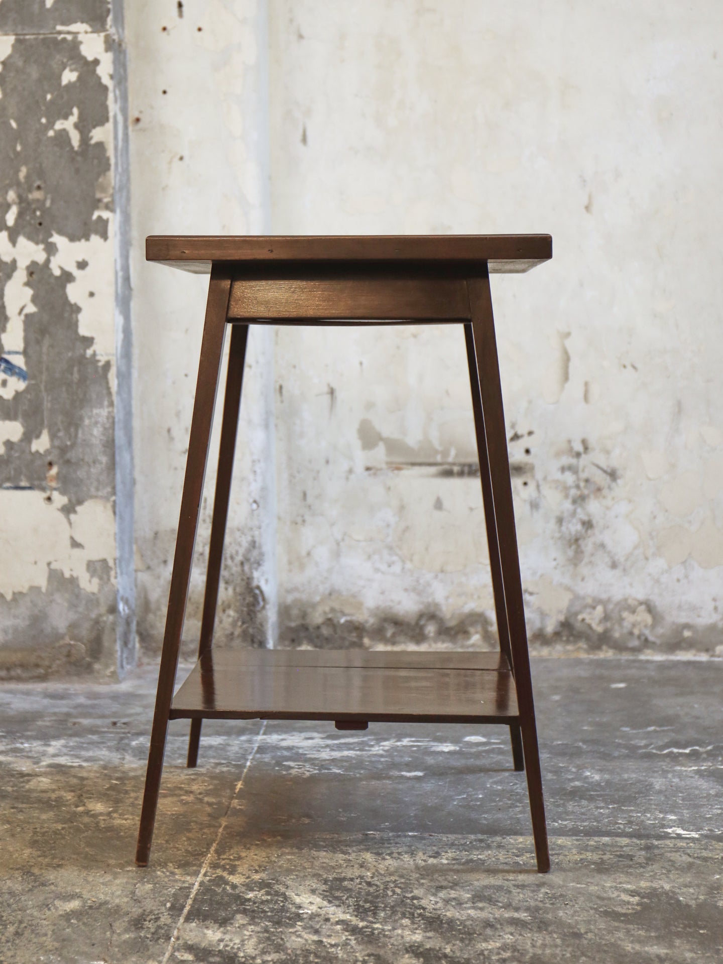 An arts and crafts table with tapering square leg, green majolica inset tiled top and lower shelf.