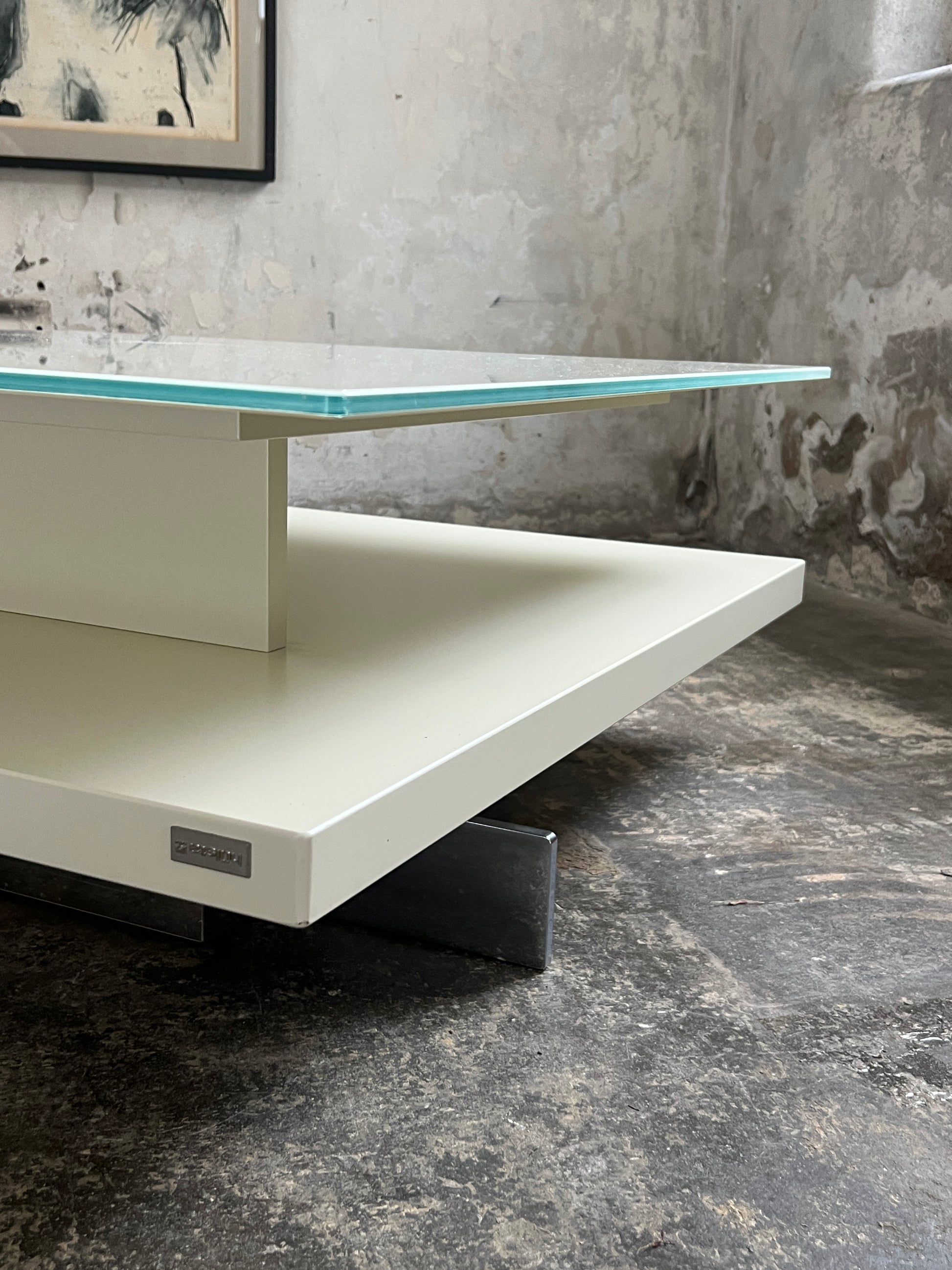 A "Hulsta" CT 90 rectangular two tier coffee table, opaque glass, laminate timber on a heavy chromed steel base.