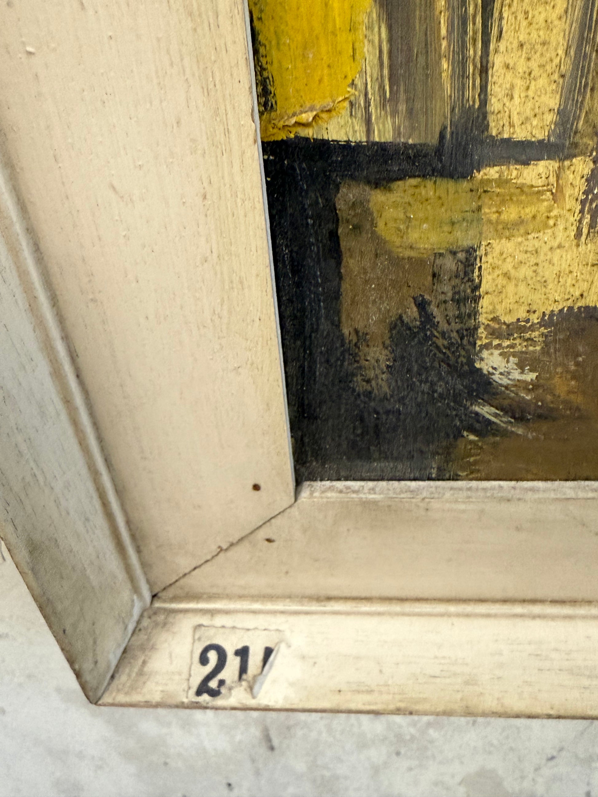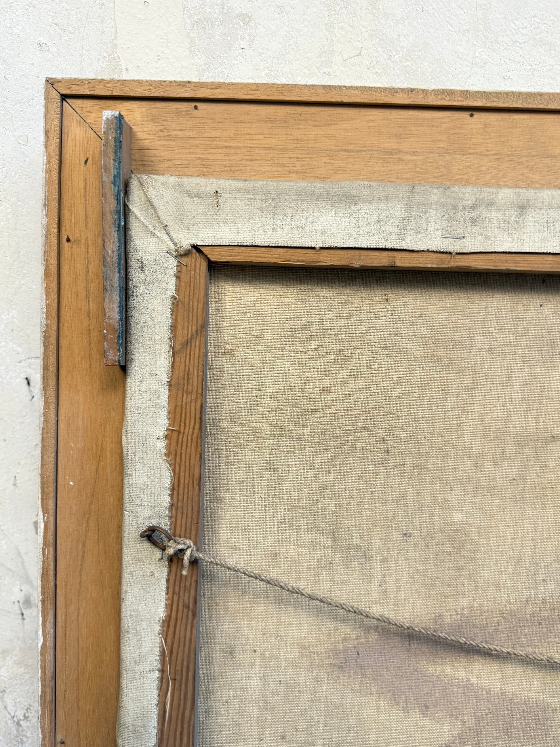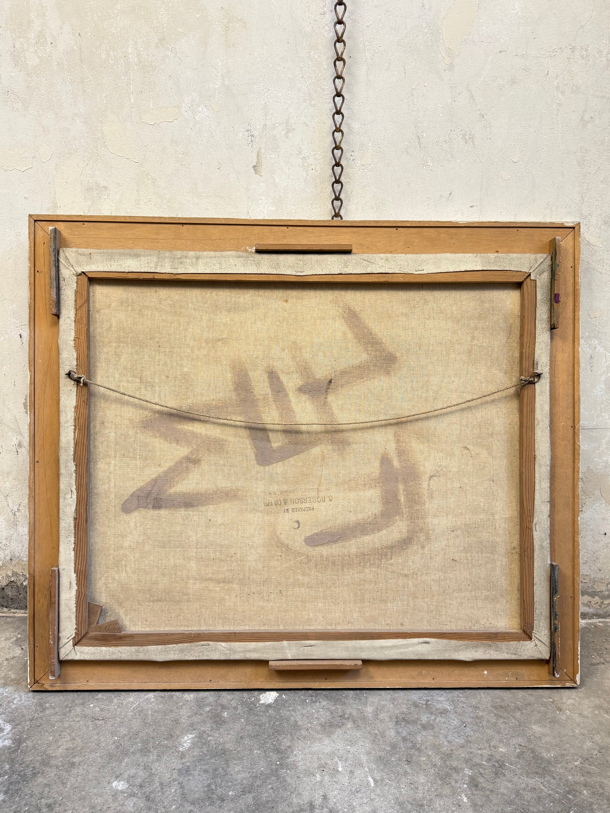 The paint surface is stable with strong colours and no signs of craquelure or loss. The simple wooden painted frame has been left in as found condition, with some signs of discolouration.